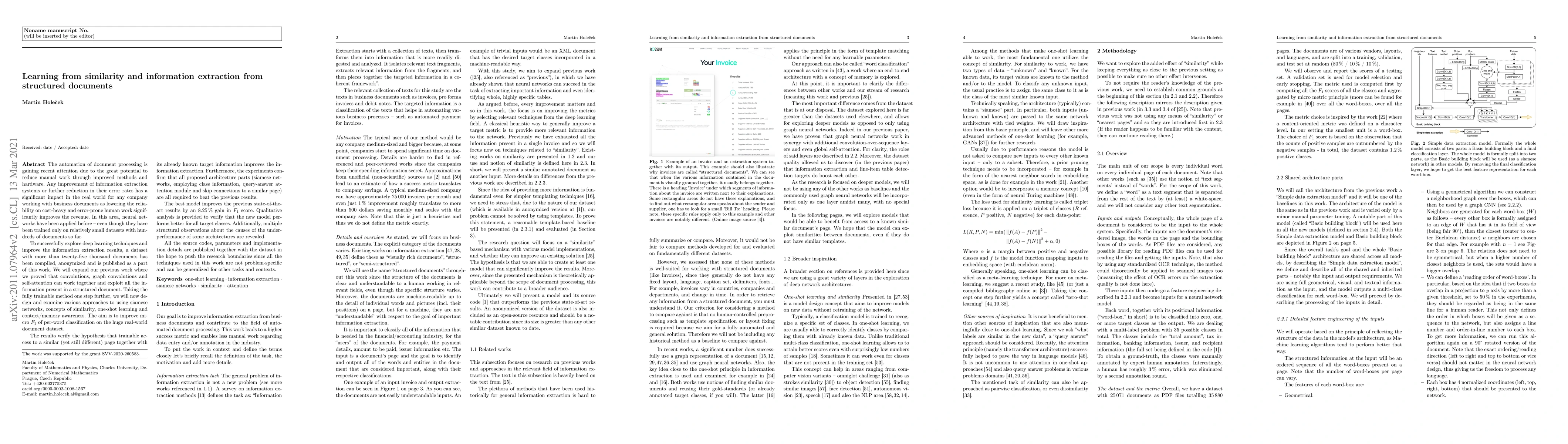 The automation of document processing is gaining recent attention due to the great potential to reduce manual work through improved methods and hardware. Neural networks have been successfully applied before - even though they have been trained only on relatively small datasets with hundreds of documents so far. To successfully explore deep learning techniques and improve the information extraction results, a dataset with more than twenty-five thousand documents has been compiled, anonymized and is published as a part of this work. We will expand our previous work where we proved that convolutions, graph convolutions and self-attention can work together and exploit all the information present in a structured document. Taking the fully trainable method one step further, we will now design and examine various approaches to using siamese networks, concepts of similarity, one-shot learning and context/memory awareness. The aim is to improve micro F1 of per-word classification on the huge real-world document dataset. The results verify the hypothesis that trainable access to a similar (yet still different) page together with its already known target information improves the information extraction. Furthermore, the experiments confirm that all proposed architecture parts are all required to beat the previous results. The best model improves the previous state-of-the-art results by an 8.25 gain in F1 score. Qualitative analysis is provided to verify that the new model performs better for all target classes. Additionally, multiple structural observations about the causes of the underperformance of some architectures are revealed. All the source codes, parameters and implementation details are published together with the dataset in the hope to push the research boundaries since all the techniques used in this work are not problem-specific and can be generalized for other tasks and contexts.