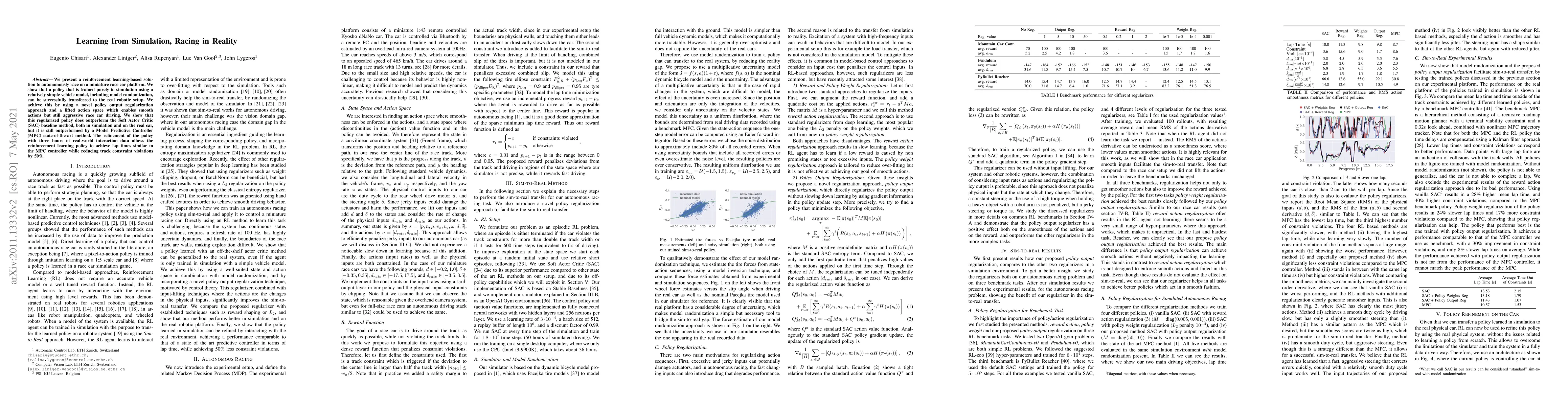 We present a reinforcement learning-based solution to autonomously race on a miniature race car platform. We show that a policy that is trained purely in simulation using a relatively simple vehicle model, including model randomization, can be successfully transferred to the real robotic setup. We achieve this by using novel policy output regularization approach and a lifted action space which enables smooth actions but still aggressive race car driving. We show that this regularized policy does outperform the Soft Actor Critic (SAC) baseline method, both in simulation and on the real car, but it is still outperformed by a Model Predictive Controller (MPC) state of the art method. The refinement of the policy with three hours of real-world interaction data allows the reinforcement learning policy to achieve lap times similar to the MPC controller while reducing track constraint violations by 50%.