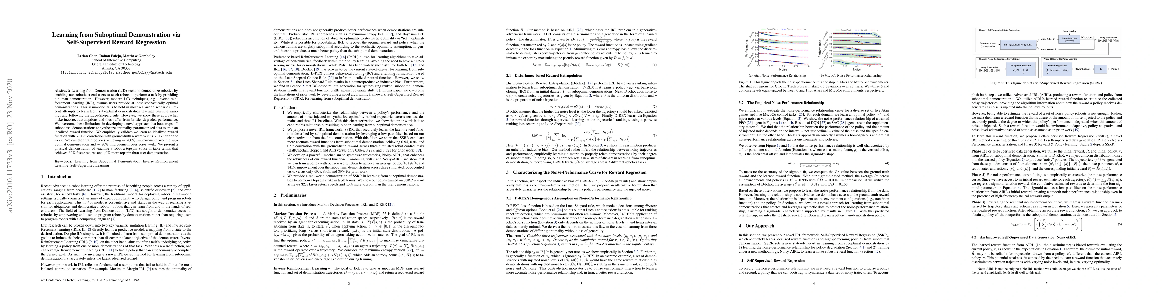 This paper proposes a novel self-supervised reward regression method to learn from suboptimal demonstrations in robotics, achieving significant improvements over prior techniques. The method synthesizes optimality-parameterized data to train an idealized reward function, demonstrating a 200% policy improvement over suboptimal demonstrations and a 90% improvement over prior work.
