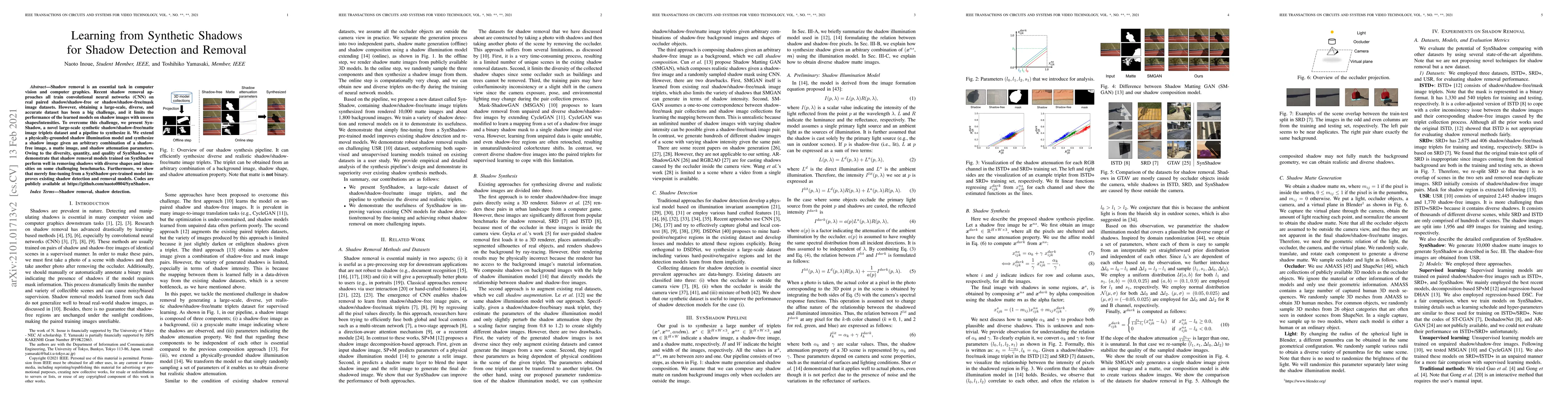 This paper introduces SynShadow, a synthetic dataset for shadow detection and removal, addressing the challenge of limited real-world datasets. The authors demonstrate that models trained on this synthetic data effectively remove shadows with diverse shapes and intensities, and fine-tuning existing models with SynShadow improves their performance.