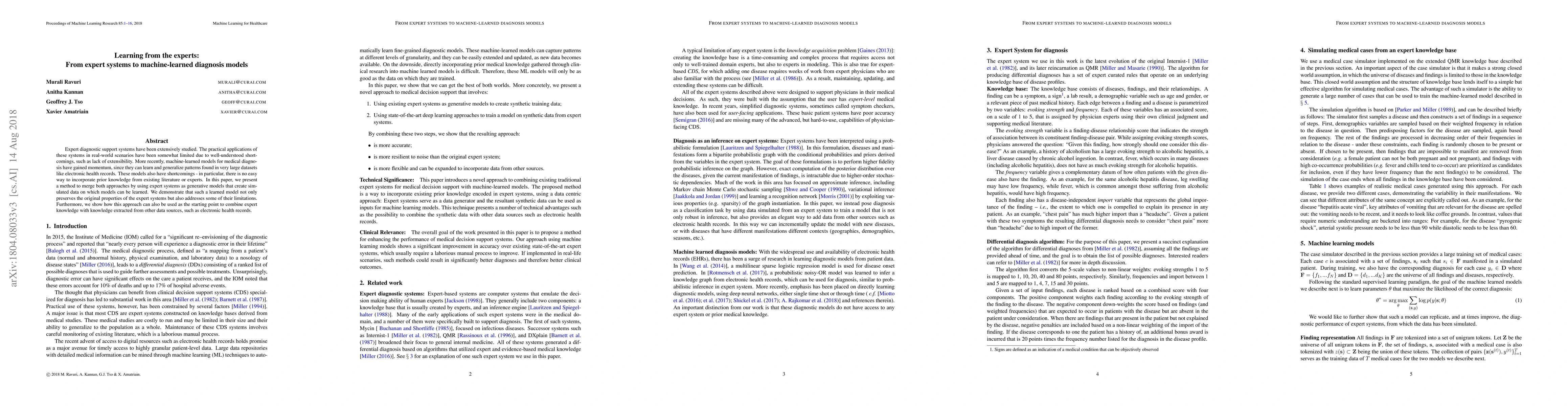 Expert diagnostic support systems have been extensively studied. The practical applications of these systems in real-world scenarios have been somewhat limited due to well-understood shortcomings, such as lack of extensibility. More recently, machine-learned models for medical diagnosis have gained momentum, since they can learn and generalize patterns found in very large datasets like electronic health records. These models also have shortcomings - in particular, there is no easy way to incorporate prior knowledge from existing literature or experts. In this paper, we present a method to merge both approaches by using expert systems as generative models that create simulated data on which models can be learned. We demonstrate that such a learned model not only preserves the original properties of the expert systems but also addresses some of their limitations. Furthermore, we show how this approach can also be used as the starting point to combine expert knowledge with knowledge extracted from other data sources, such as electronic health records.