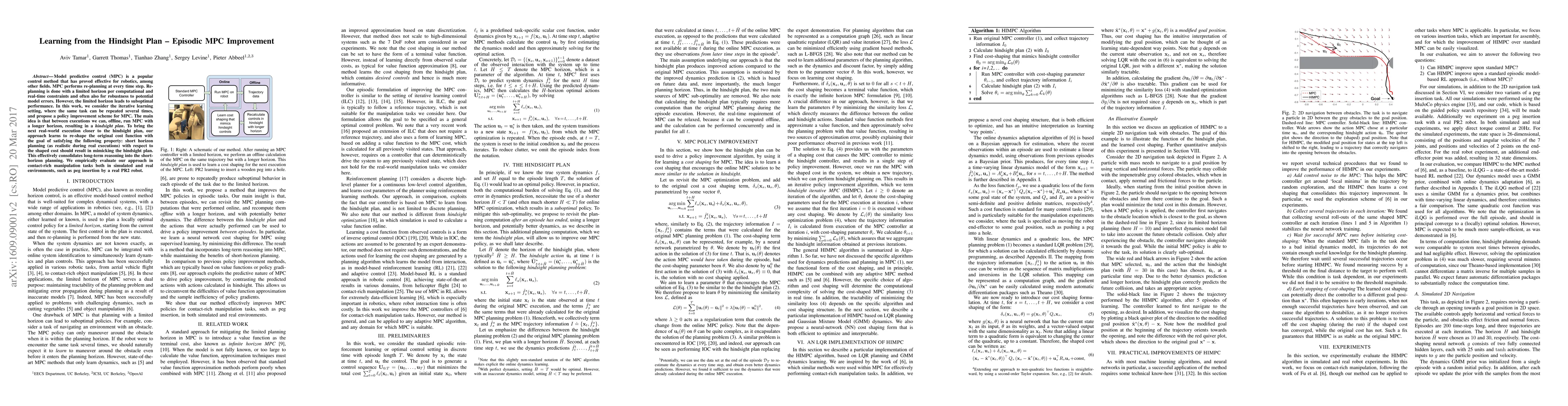 Model predictive control (MPC) is a popular control method that has proved effective for robotics, among other fields. MPC performs re-planning at every time step. Re-planning is done with a limited horizon per computational and real-time constraints and often also for robustness to potential model errors. However, the limited horizon leads to suboptimal performance. In this work, we consider the iterative learning setting, where the same task can be repeated several times, and propose a policy improvement scheme for MPC. The main idea is that between executions we can, offline, run MPC with a longer horizon, resulting in a hindsight plan. To bring the next real-world execution closer to the hindsight plan, our approach learns to re-shape the original cost function with the goal of satisfying the following property: short horizon planning (as realistic during real executions) with respect to the shaped cost should result in mimicking the hindsight plan. This effectively consolidates long-term reasoning into the short-horizon planning. We empirically evaluate our approach in contact-rich manipulation tasks both in simulated and real environments, such as peg insertion by a real PR2 robot.