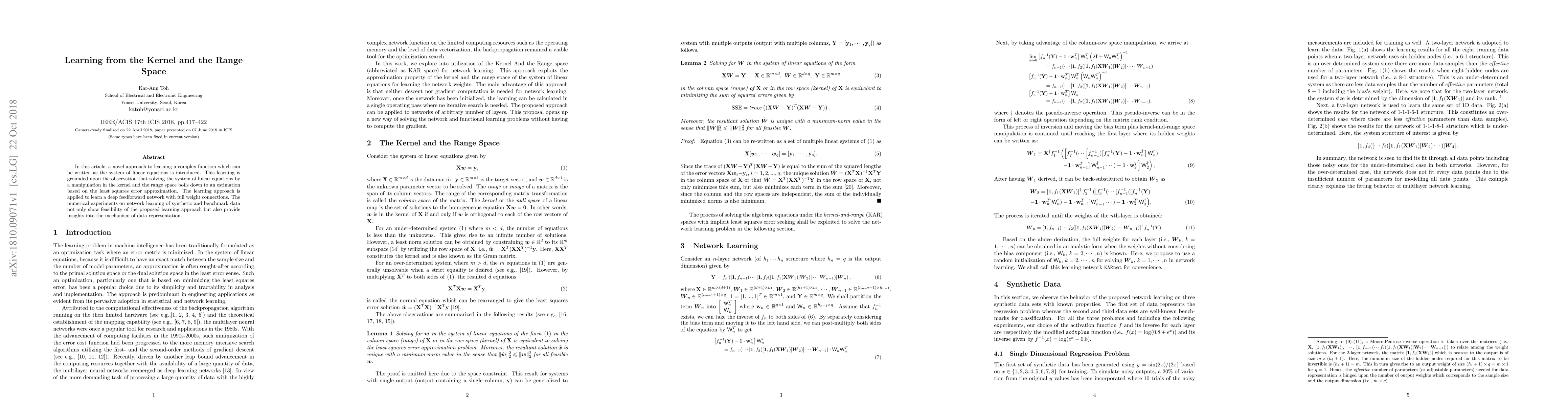 In this article, a novel approach to learning a complex function which can be written as the system of linear equations is introduced. This learning is grounded upon the observation that solving the system of linear equations by a manipulation in the kernel and the range space boils down to an estimation based on the least squares error approximation. The learning approach is applied to learn a deep feedforward network with full weight connections. The numerical experiments on network learning of synthetic and benchmark data not only show feasibility of the proposed learning approach but also provide insights into the mechanism of data representation.