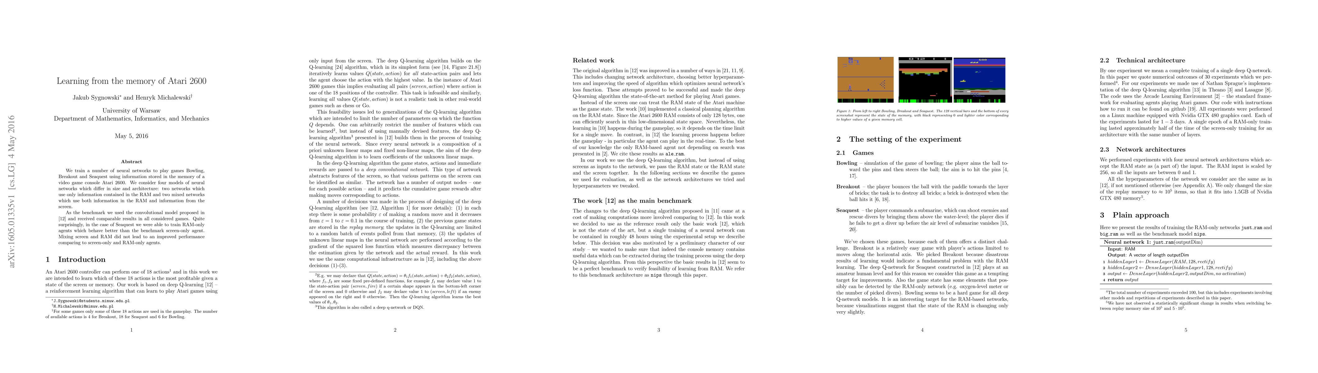 This research trains neural networks to play Atari 2600 games using the console's memory, comparing RAM-only and mixed RAM-screen models. Surprisingly, RAM-only agents outperformed screen-only agents in Seaquest, while mixed models did not improve performance.
