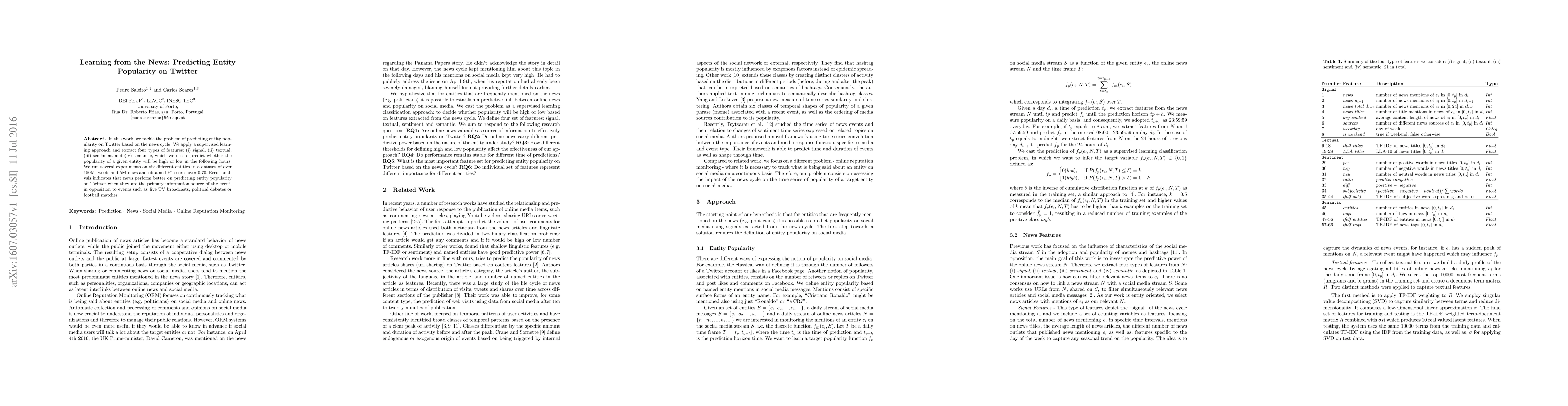 This study develops a supervised learning model to predict Twitter entity popularity based on news features, including signals, text, sentiment, and semantics. Experiments on six entities using over 150M tweets and 5M news articles achieved F1 scores above 0.70, indicating news are more effective predictors than live broadcasts.