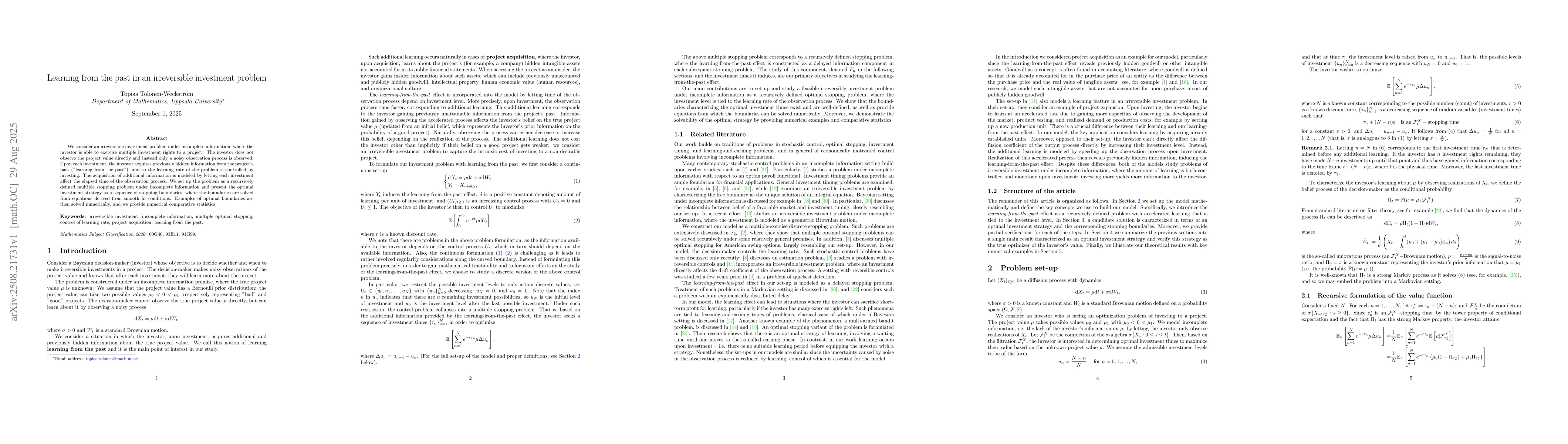 We consider an irreversible investment problem under incomplete information, where the investor is able to exercise multiple investment rights to a project. The investor does not observe the project value directly and instead only a noisy observation process is observed. Upon each investment, the investor acquires previously hidden information from the project's past (''learning from the past''), and so the learning rate of the problem is controlled by investing. The acquisition of additional information is modeled by letting each investment affect the elapsed time of the observation process. We set up the problem as a recursively defined multiple stopping problem under incomplete information and present the optimal investment strategy as a sequence of stopping boundaries, where the boundaries are solved from equations derived from smooth fit conditions. Examples of optimal boundaries are then solved numerically, and we provide numerical comparative statistics.