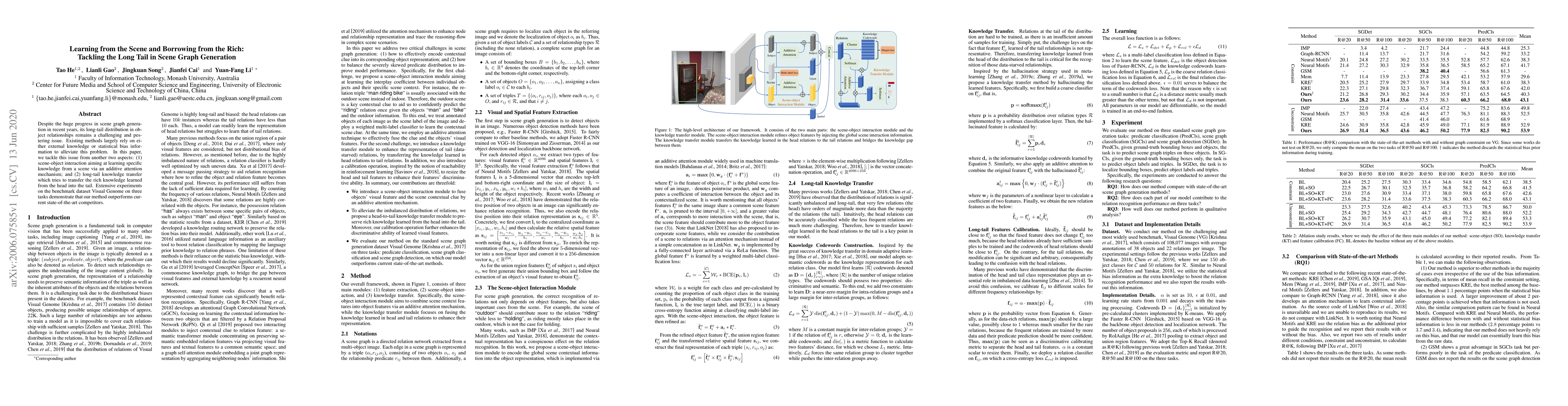Despite the huge progress in scene graph generation in recent years, its long-tail distribution in object relationships remains a challenging and pestering issue. Existing methods largely rely on either external knowledge or statistical bias information to alleviate this problem. In this paper, we tackle this issue from another two aspects: (1) scene-object interaction aiming at learning specific knowledge from a scene via an additive attention mechanism; and (2) long-tail knowledge transfer which tries to transfer the rich knowledge learned from the head into the tail. Extensive experiments on the benchmark dataset Visual Genome on three tasks demonstrate that our method outperforms current state-of-the-art competitors.