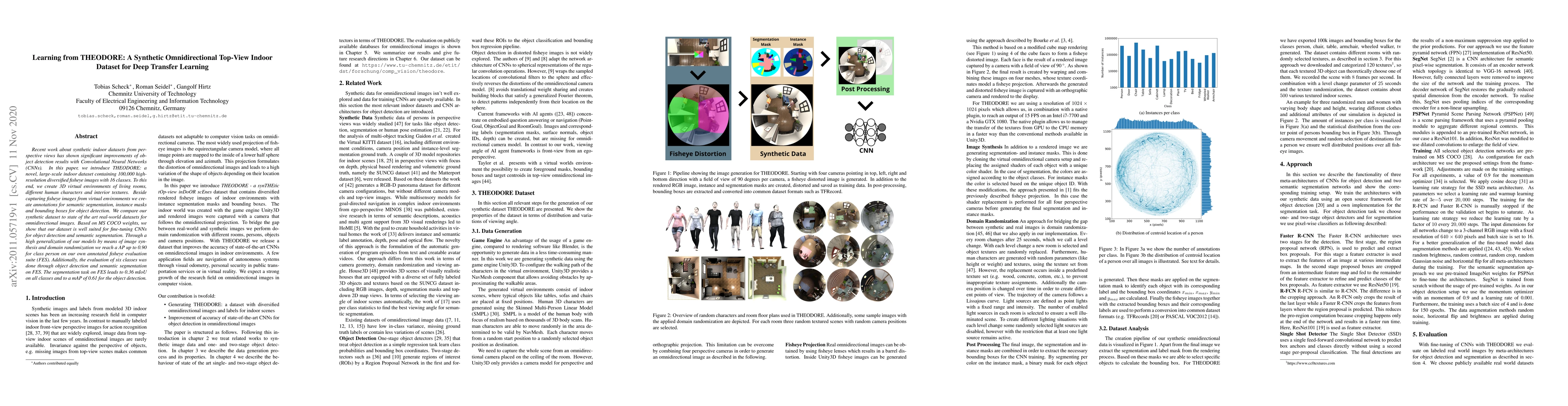 Recent work about synthetic indoor datasets from perspective views has shown significant improvements of object detection results with Convolutional Neural Networks(CNNs). In this paper, we introduce THEODORE: a novel, large-scale indoor dataset containing 100,000 high-resolution diversified fisheye images with 14 classes. To this end, we create 3D virtual environments of living rooms, different human characters and interior textures. Beside capturing fisheye images from virtual environments we create annotations for semantic segmentation, instance masks and bounding boxes for object detection tasks. We compare our synthetic dataset to state of the art real-world datasets for omnidirectional images. Based on MS COCO weights, we show that our dataset is well suited for fine-tuning CNNs for object detection. Through a high generalization of our models by means of image synthesis and domain randomization, we reach an AP up to 0.84 for class person on High-Definition Analytics dataset.