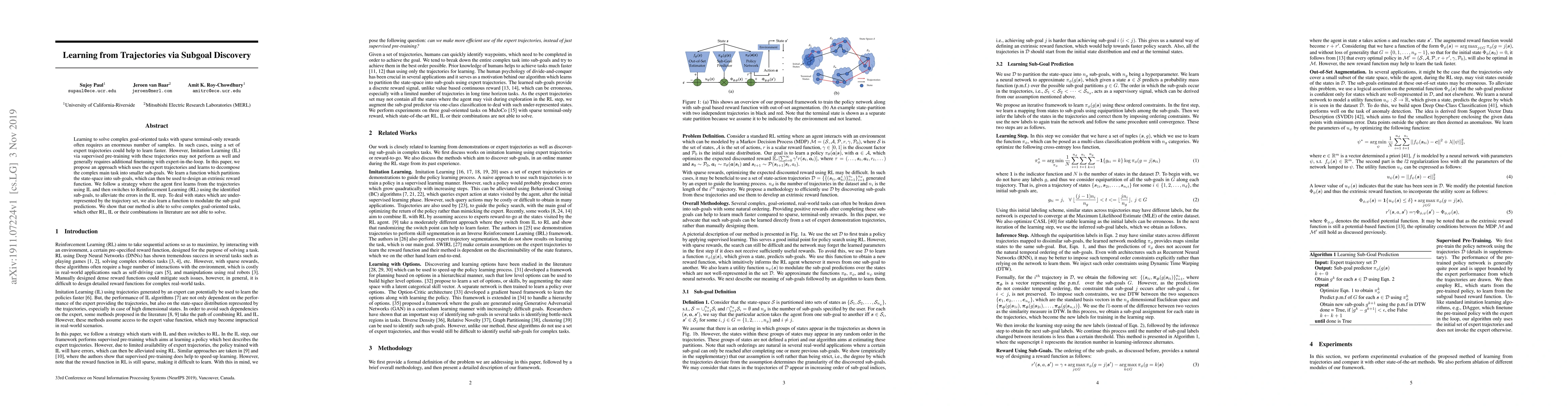Learning to solve complex goal-oriented tasks with sparse terminal-only rewards often requires an enormous number of samples. In such cases, using a set of expert trajectories could help to learn faster. However, Imitation Learning (IL) via supervised pre-training with these trajectories may not perform as well and generally requires additional finetuning with expert-in-the-loop. In this paper, we propose an approach which uses the expert trajectories and learns to decompose the complex main task into smaller sub-goals. We learn a function which partitions the state-space into sub-goals, which can then be used to design an extrinsic reward function. We follow a strategy where the agent first learns from the trajectories using IL and then switches to Reinforcement Learning (RL) using the identified sub-goals, to alleviate the errors in the IL step. To deal with states which are under-represented by the trajectory set, we also learn a function to modulate the sub-goal predictions. We show that our method is able to solve complex goal-oriented tasks, which other RL, IL or their combinations in literature are not able to solve.
