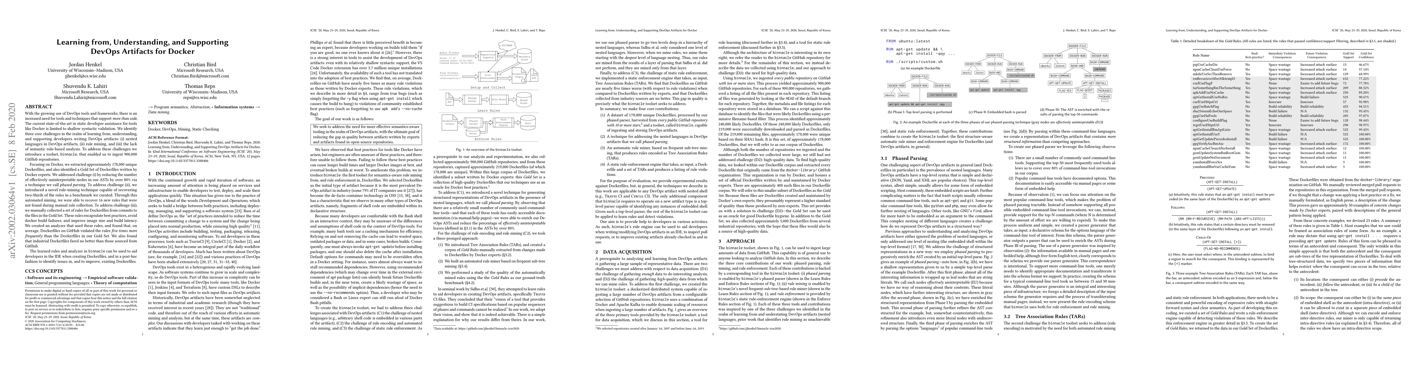 This paper addresses the limitations of current DevOps tools for Docker by identifying three key challenges: nested languages, rule mining, and lack of semantic analysis. The authors introduce binnacle, a toolset that employs phased parsing and novel rule-mining techniques to analyze Dockerfiles from 900,000 GitHub repositories, identifying best practices and improving developer support.