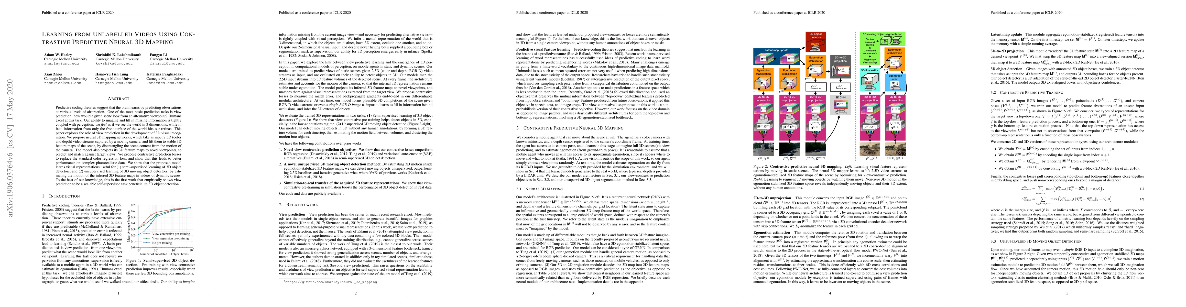 This paper proposes neural 3D mapping networks that use contrastive predictive losses to learn from unlabelled 2.5D video streams, enabling stable 3D feature map generation and view prediction. The approach demonstrates improved performance in semi-supervised and unsupervised learning of 3D object detectors.