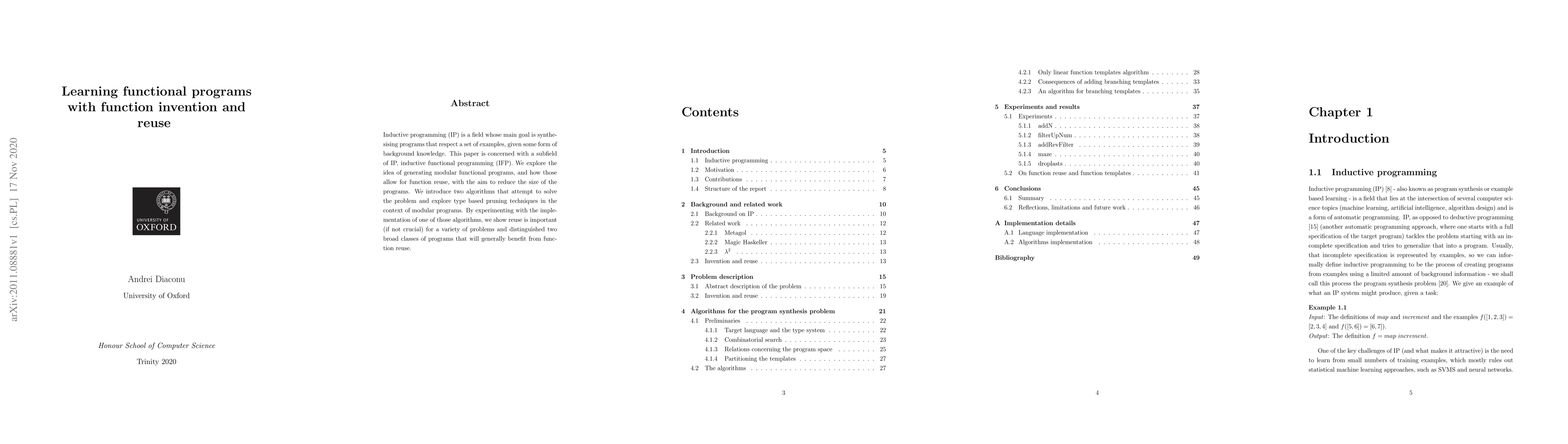 Inductive programming (IP) is a field whose main goal is synthesising programs that respect a set of examples, given some form of background knowledge. This paper is concerned with a subfield of IP, inductive functional programming (IFP). We explore the idea of generating modular functional programs, and how those allow for function reuse, with the aim to reduce the size of the programs. We introduce two algorithms that attempt to solve the problem and explore type based pruning techniques in the context of modular programs. By experimenting with the implementation of one of those algorithms, we show reuse is important (if not crucial) for a variety of problems and distinguished two broad classes of programs that will generally benefit from function reuse.