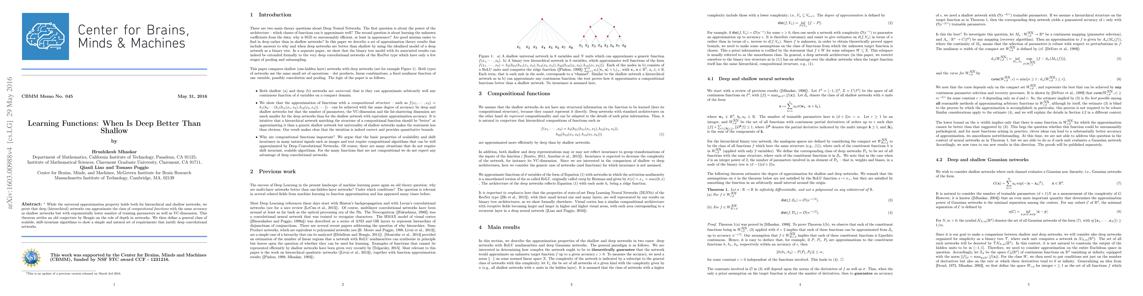 While the universal approximation property holds both for hierarchical and shallow networks, we prove that deep (hierarchical) networks can approximate the class of compositional functions with the same accuracy as shallow networks but with exponentially lower number of training parameters as well as VC-dimension. This theorem settles an old conjecture by Bengio on the role of depth in networks. We then define a general class of scalable, shift-invariant algorithms to show a simple and natural set of requirements that justify deep convolutional networks.