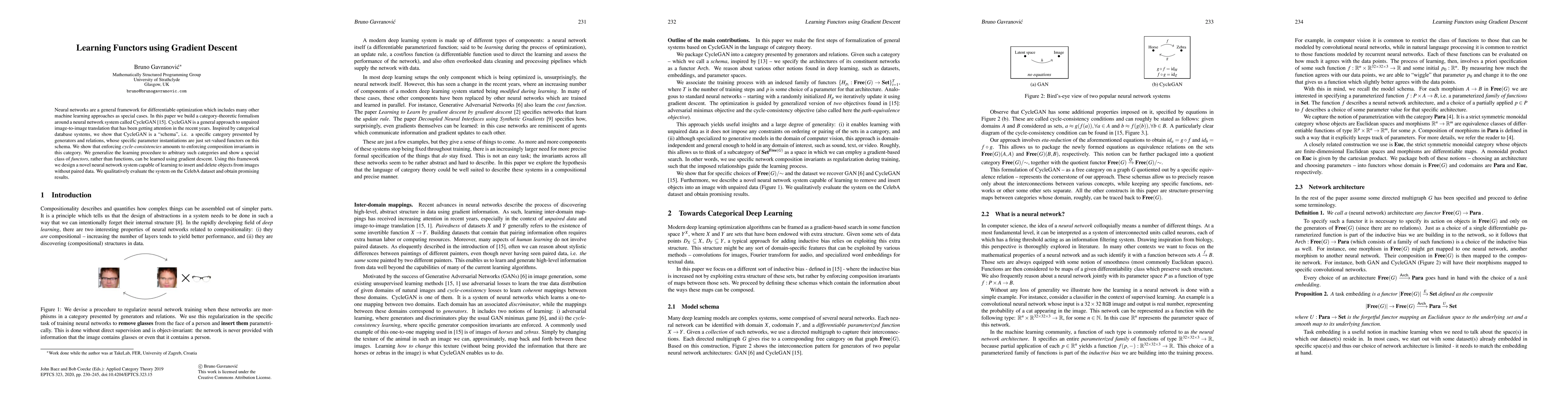 Neural networks are a general framework for differentiable optimization which includes many other machine learning approaches as special cases. In this paper we build a category-theoretic formalism around a neural network system called CycleGAN. CycleGAN is a general approach to unpaired image-to-image translation that has been getting attention in the recent years. Inspired by categorical database systems, we show that CycleGAN is a "schema", i.e. a specific category presented by generators and relations, whose specific parameter instantiations are just set-valued functors on this schema. We show that enforcing cycle-consistencies amounts to enforcing composition invariants in this category. We generalize the learning procedure to arbitrary such categories and show a special class of functors, rather than functions, can be learned using gradient descent. Using this framework we design a novel neural network system capable of learning to insert and delete objects from images without paired data. We qualitatively evaluate the system on the CelebA dataset and obtain promising results.