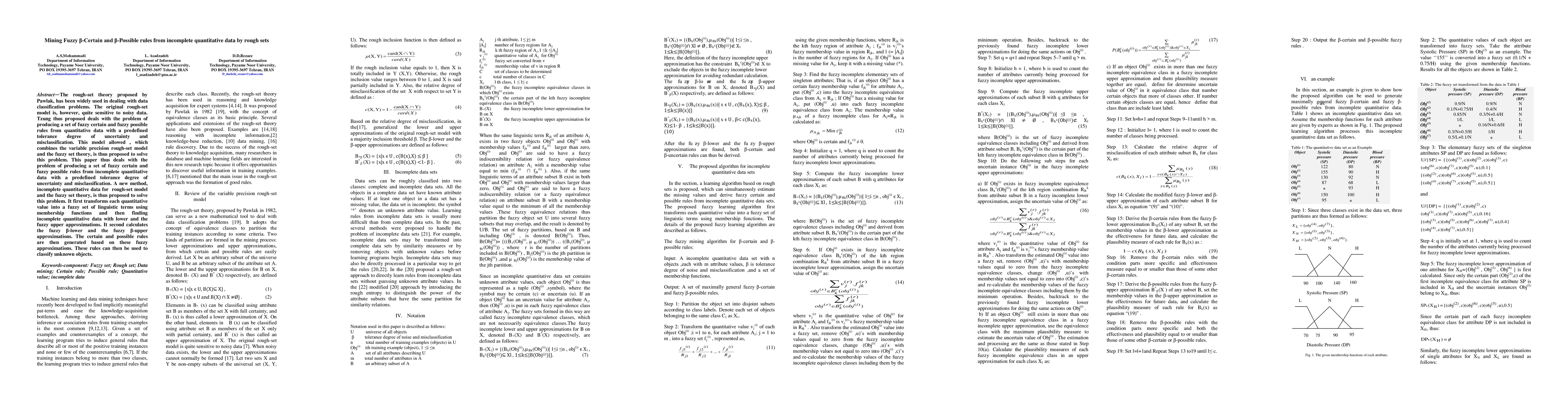 This paper proposes a method combining rough set theory and fuzzy set theory to generate fuzzy certain and fuzzy possible rules from incomplete quantitative data, addressing the sensitivity of traditional rough sets to noisy data. The approach uses membership functions to transform quantitative data and calculates fuzzy β-approximations to generate classification rules for unknown objects.