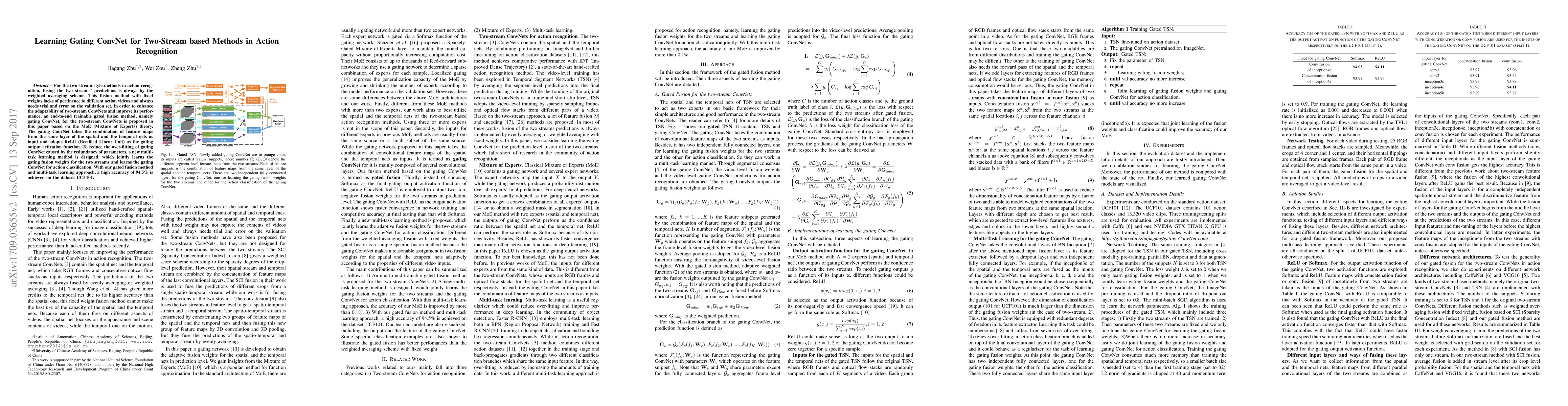 This paper proposes a gating ConvNet for two-stream based action recognition methods to adaptively fuse spatial and temporal streams, improving performance over fixed weighting. The method employs a Mixture of Experts theory and multi-task learning to achieve 94.5% accuracy on the UCF101 dataset.