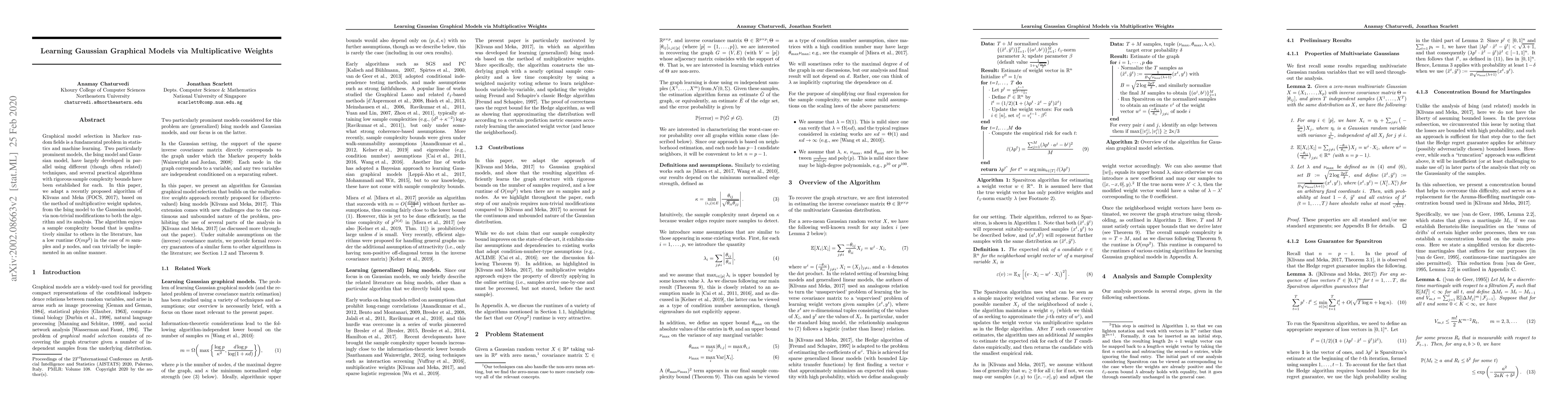 This paper adapts a multiplicative weights algorithm from the Ising model to the Gaussian graphical model, achieving similar sample complexity and runtime $O(mp^2)$ while maintaining online implementation feasibility. The adaptation involves significant modifications to both the algorithm and its theoretical analysis.