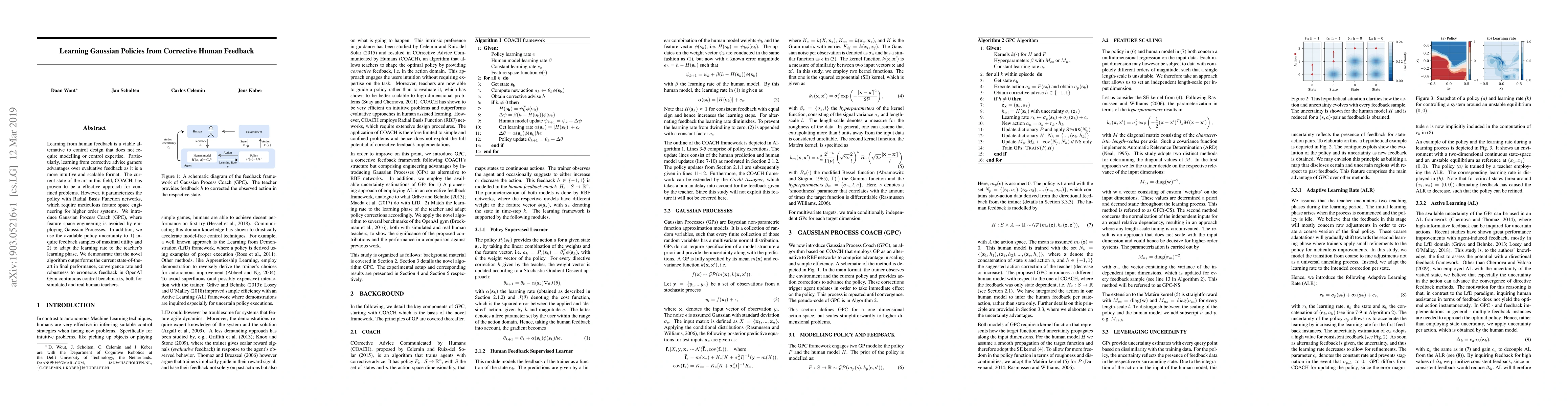 This paper introduces Gaussian Process Coach (GPC), a novel method for learning Gaussian policies from corrective human feedback, which leverages Gaussian Processes to avoid feature space engineering. The method also utilizes policy uncertainty to optimize feedback sample acquisition and adapt learning rates, demonstrating superior performance, faster convergence, and better robustness compared to the current state-of-the-art COACH method in continuous control tasks.