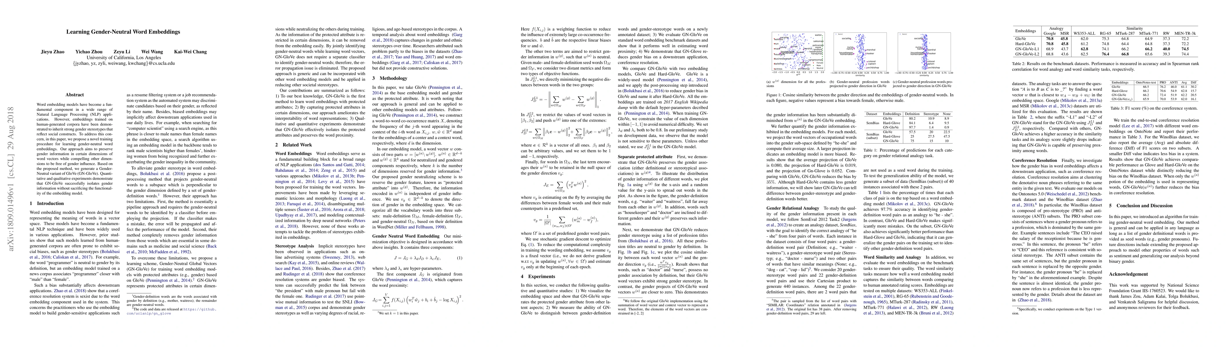 This paper proposes a novel training procedure for learning gender-neutral word embeddings that isolate gender information while preserving the functionality of the embedding model. The method generates a Gender-Neutral variant of GloVe (GN-GloVe), which successfully reduces gender stereotypes without compromising model performance.