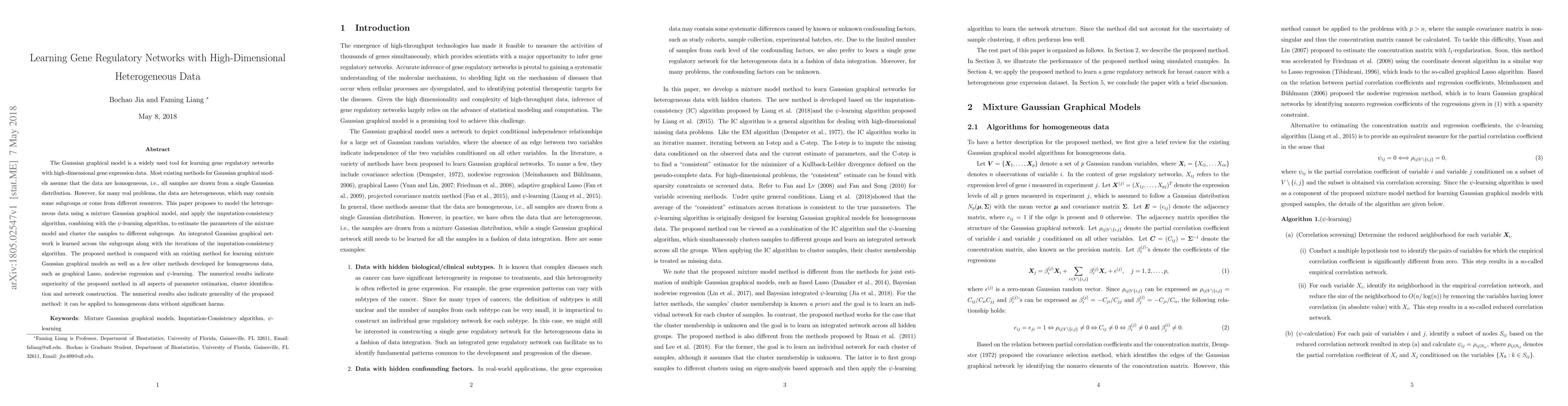 This paper proposes a mixture Gaussian graphical model to learn gene regulatory networks from high-dimensional heterogeneous gene expression data, employing an imputation-consistency algorithm combined with the $\psi$-learning algorithm for parameter estimation and subgroup clustering. The method outperforms existing techniques in parameter estimation, subgroup identification, and network construction.