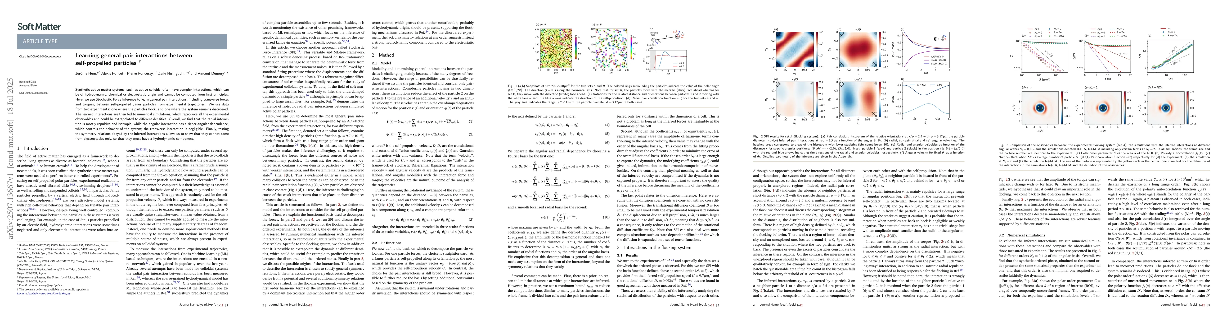 Synthetic active matter systems, such as active colloids, often have complex interactions, which can be of hydrodynamic, chemical or electrostatic origin and cannot be computed from first principles. Here, we use Stochastic Force Inference to learn general pair interactions, including transverse forces and torques, between self-propelled Janus particles from experimental trajectories. We use data from two experiments: one where the particles flock, and one where the system remains disordered. The learned interactions are then fed to numerical simulations, which reproduce all the experimental observables and could be extrapolated to different densities. Overall, we find that the radial interaction is mostly repulsive and isotropic, while the angular interaction has a richer angular dependence, which controls the behavior of the system; the transverse interaction is negligible. Finally, testing the symmetry relations obeyed by the inferred interactions allows us to show that they cannot come from electrostatics only, so that they must have a hydrodynamic component.