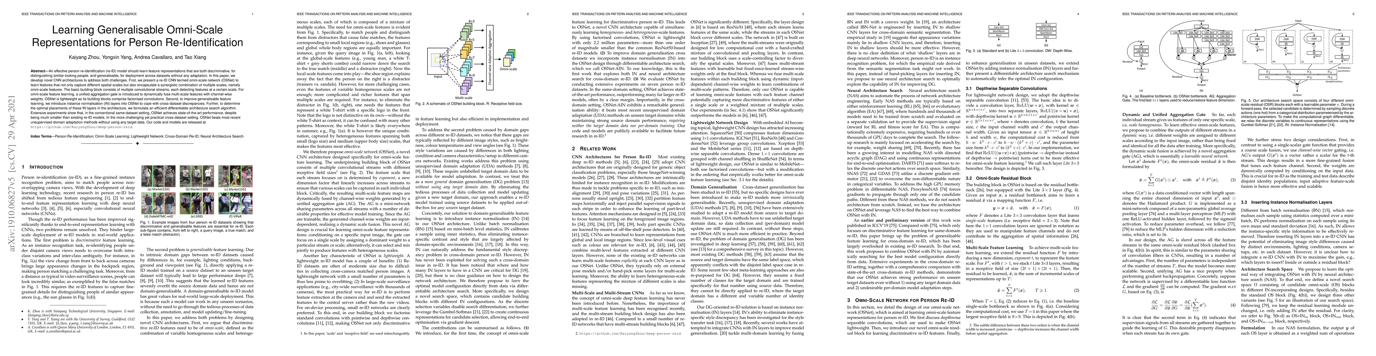 This paper proposes an omni-scale network (OSNet) with factorised convolutions to learn discriminative and generalisable features for person re-identification. It employs instance normalisation and a differentiable architecture search algorithm to enhance cross-dataset performance, achieving state-of-the-art results both within and across datasets.