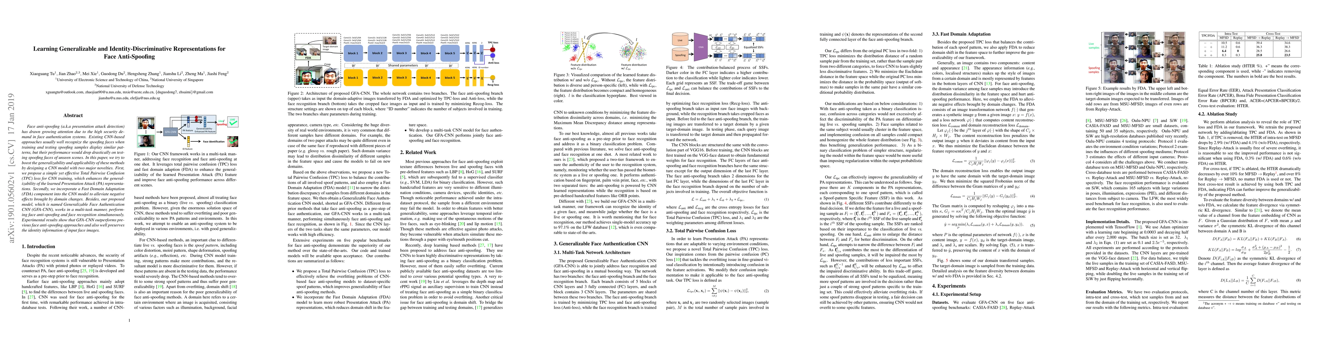 This paper proposes a CNN model named GFA-CNN to enhance face anti-spoofing by introducing a Total Pairwise Confusion loss and a Fast Domain Adaptation component to improve generalizability and identity discrimination. The model also performs face recognition, achieving better performance than previous methods.