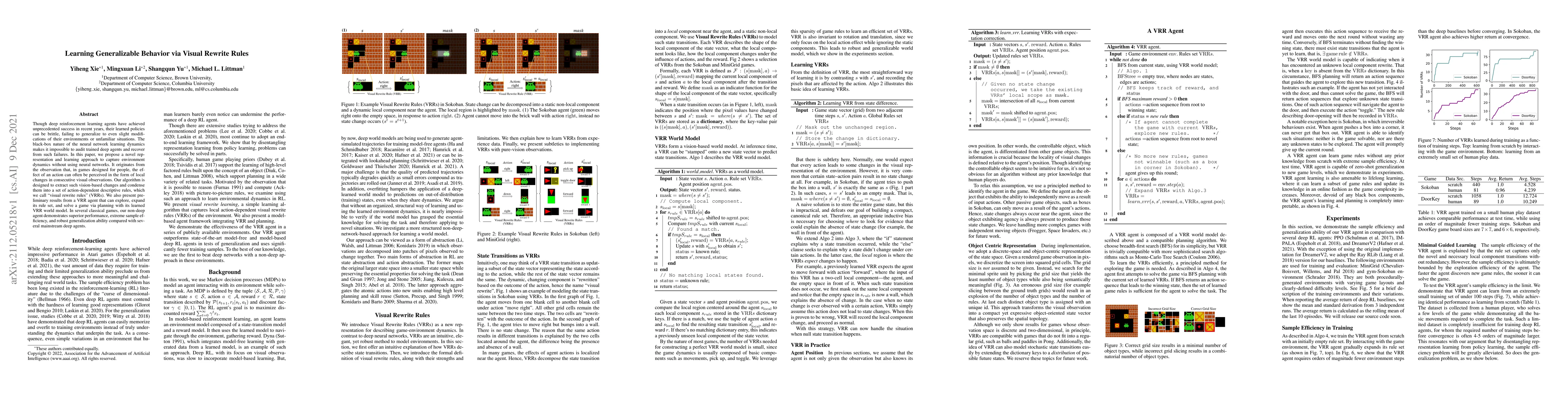 This paper proposes a novel method to learn generalizable behavior via visual rewrite rules (VRRs) that capture environment dynamics without using neural networks, demonstrating superior performance, sample efficiency, and robust generalization in classical games compared to deep reinforcement learning agents.
