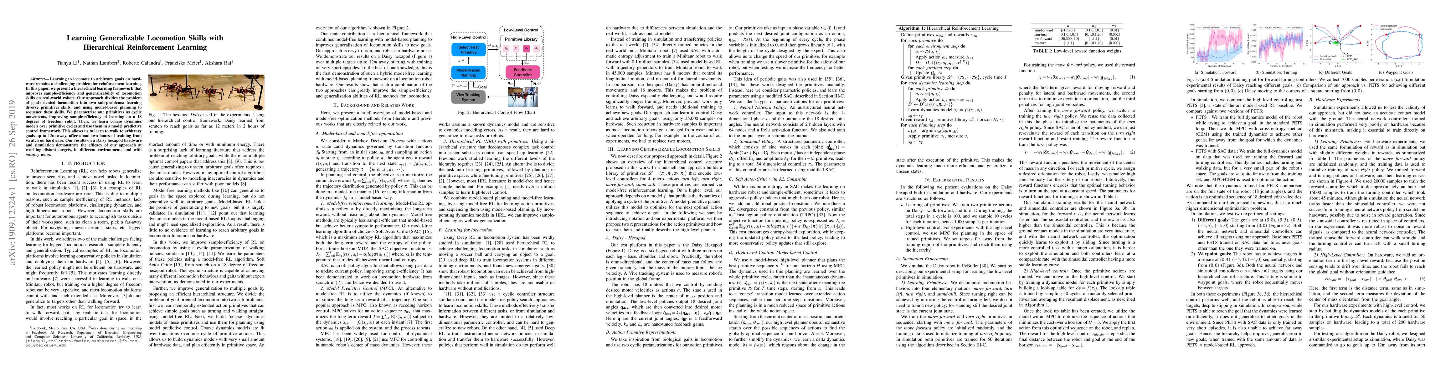 Learning to locomote to arbitrary goals on hardware remains a challenging problem for reinforcement learning. In this paper, we present a hierarchical learning framework that improves sample-efficiency and generalizability of locomotion skills on real-world robots. Our approach divides the problem of goal-oriented locomotion into two sub-problems: learning diverse primitives skills, and using model-based planning to sequence these skills. We parametrize our primitives as cyclic movements, improving sample-efficiency of learning on a 18 degrees of freedom robot. Then, we learn coarse dynamics models over primitive cycles and use them in a model predictive control framework. This allows us to learn to walk to arbitrary goals up to 12m away, after about two hours of training from scratch on hardware. Our results on a Daisy hexapod hardware and simulation demonstrate the efficacy of our approach at reaching distant targets, in different environments and with sensory noise.