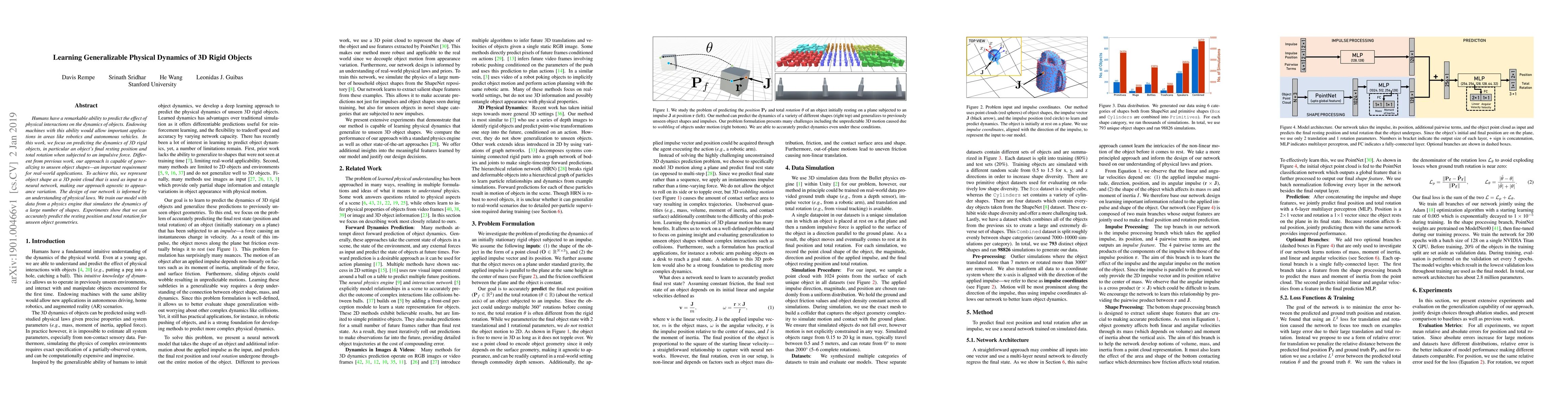 This paper presents a neural network approach to predict the dynamics of 3D rigid objects subjected to an impulsive force, focusing on their final resting position and rotation. Unlike previous methods, it generalizes to unseen object shapes by representing them as 3D point clouds and is trained using simulated physics data.
