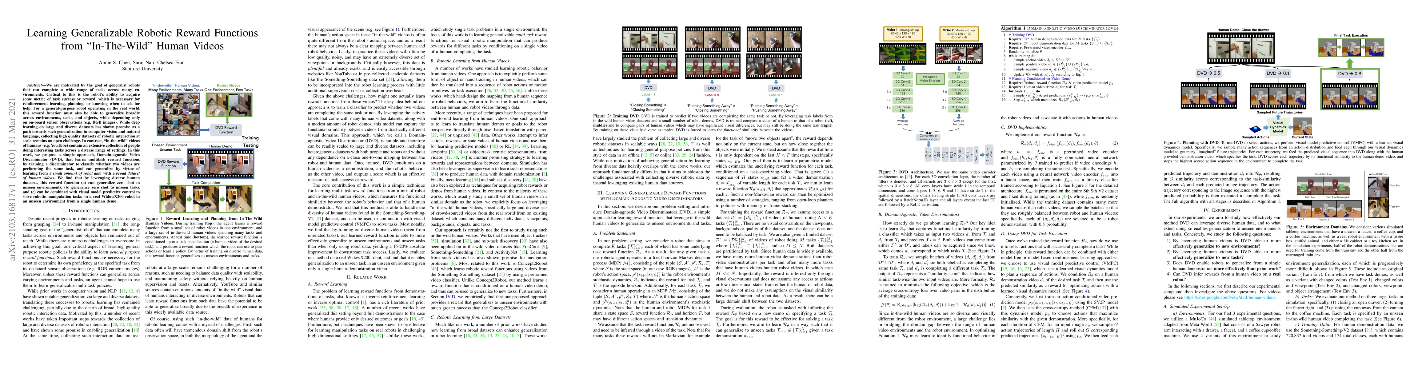 This paper proposes a method called Domain-agnostic Video Discriminator (DVD) to learn generalizable robotic reward functions from "in-the-wild" human videos. The DVD discriminator learns a reward function by classifying whether two videos perform the same task, achieving zero-shot generalization to unseen environments and tasks.