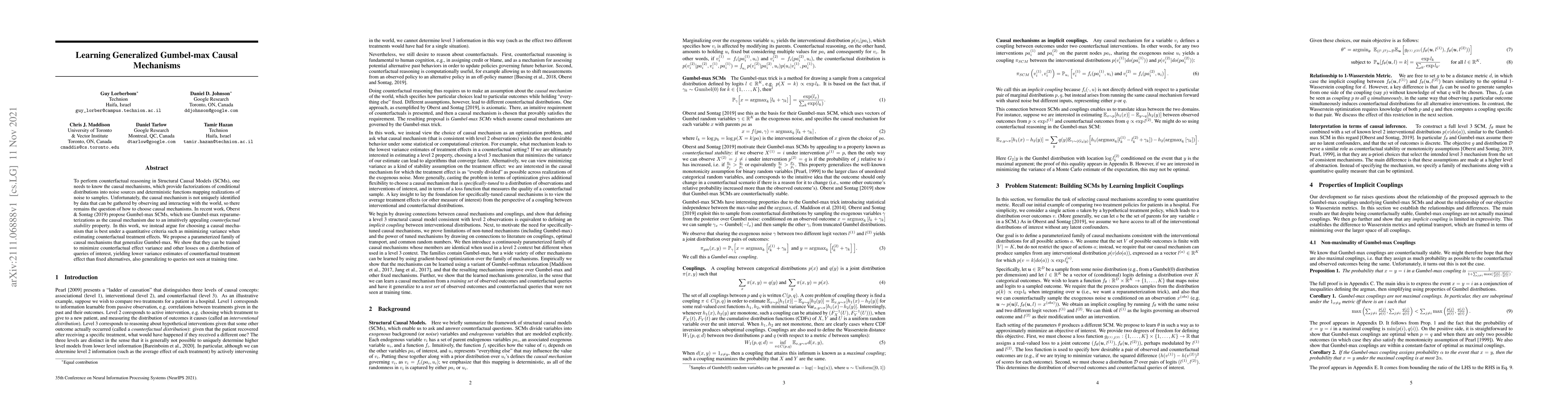 To perform counterfactual reasoning in Structural Causal Models (SCMs), one needs to know the causal mechanisms, which provide factorizations of conditional distributions into noise sources and deterministic functions mapping realizations of noise to samples. Unfortunately, the causal mechanism is not uniquely identified by data that can be gathered by observing and interacting with the world, so there remains the question of how to choose causal mechanisms. In recent work, Oberst & Sontag (2019) propose Gumbel-max SCMs, which use Gumbel-max reparameterizations as the causal mechanism due to an intuitively appealing counterfactual stability property. In this work, we instead argue for choosing a causal mechanism that is best under a quantitative criteria such as minimizing variance when estimating counterfactual treatment effects. We propose a parameterized family of causal mechanisms that generalize Gumbel-max. We show that they can be trained to minimize counterfactual effect variance and other losses on a distribution of queries of interest, yielding lower variance estimates of counterfactual treatment effect than fixed alternatives, also generalizing to queries not seen at training time.