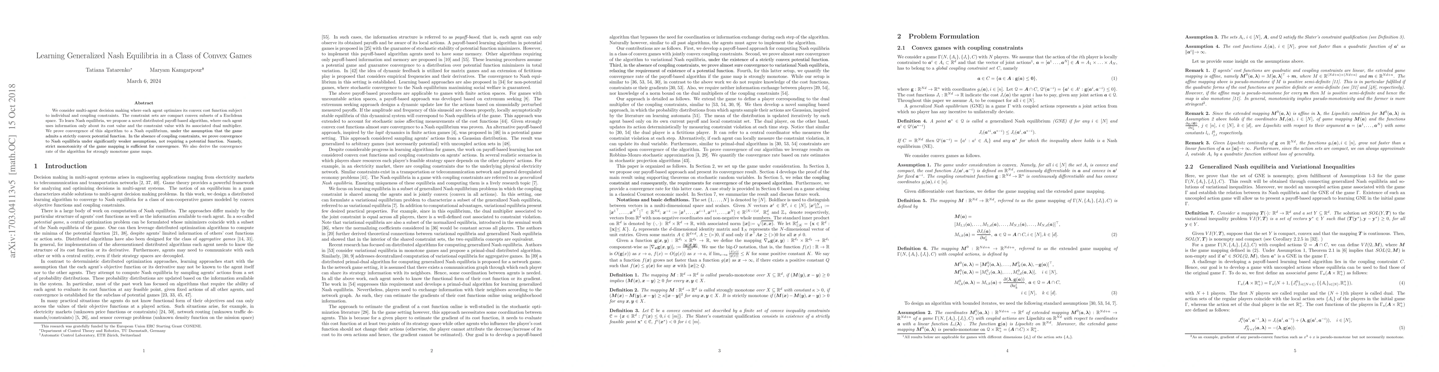 We consider multi-agent decision making where each agent optimizes its convex cost function subject to individual and coupling constraints. The constraint sets are compact convex subsets of a Euclidean space. To learn Nash equilibria, we propose a novel distributed payoff-based algorithm, such that each agent uses information only about its cost function values and the constraint function values with their associated dual multiplier. We prove convergence of this algorithm to a Nash equilibrium, under the assumption that the game admits a strictly convex potential function. In the absence of coupling constraints, we prove convergence to Nash equilibria under significantly weaker assumptions, not requiring a potential function. Namely, strict monotonicity of the game mapping is sufficient for convergence. We also derive the convergence rate of the algorithm for strongly monotone game maps.