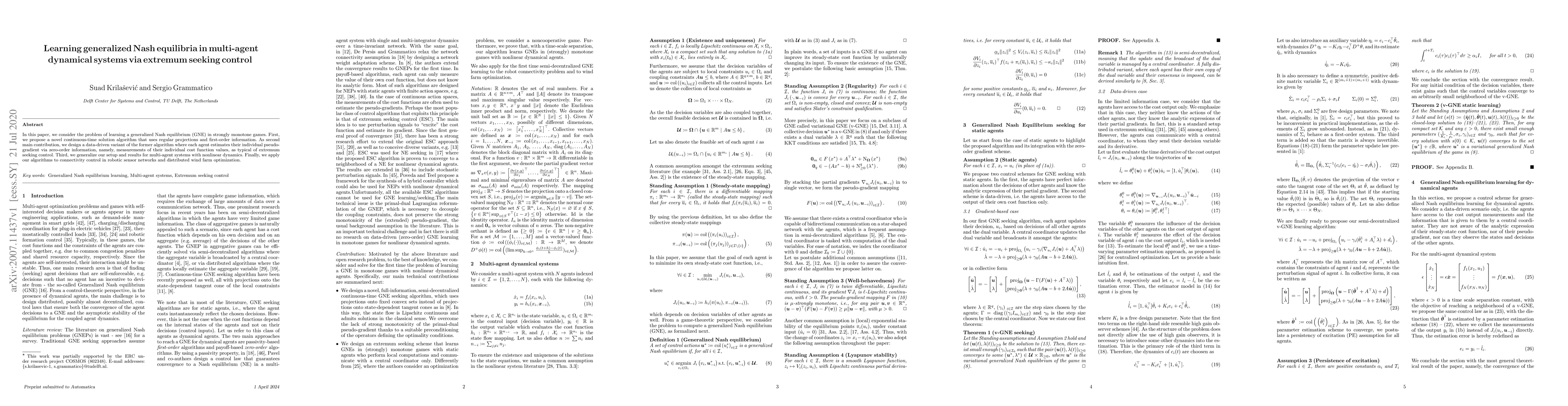 This paper proposes a continuous-time algorithm for learning generalized Nash equilibria in strongly monotone games using regular projections and first-order information. It also introduces a data-driven variant leveraging zero-order information typical of extremum seeking control, and extends the approach to multi-agent systems with nonlinear dynamics, demonstrating applications in robotic sensor networks and distributed wind farm optimization.