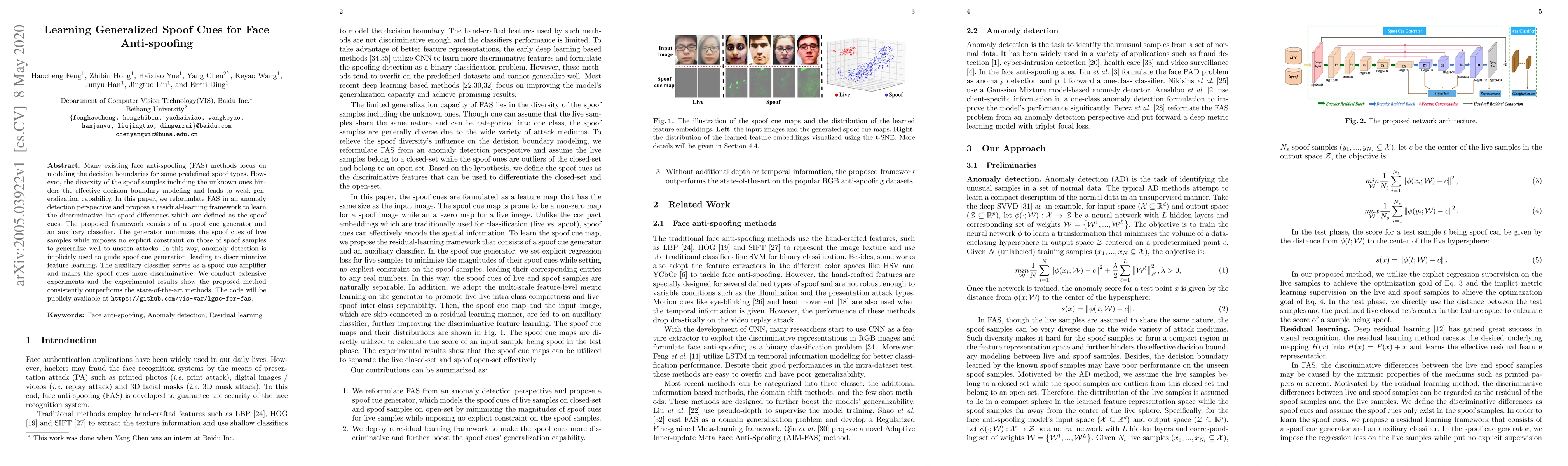 The paper proposes a face anti-spoofing method formulated as anomaly detection, utilizing a residual learning framework with a spoof cue generator and an auxiliary classifier to learn generalized spoof cues from live and spoof samples.