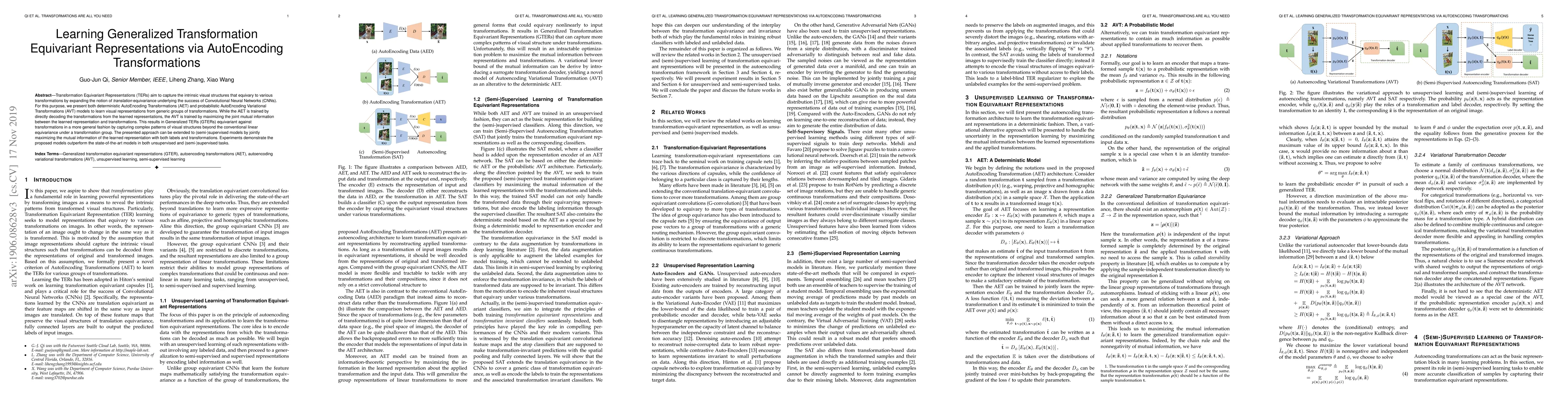 This paper introduces AutoEncoding Transformations (AET) and AutoEncoding Variational Transformations (AVT) to learn Generalized Transformation Equivariant Representations (GTERs) that capture complex visual structures invariant to various transformations. The AVT model, in particular, maximizes mutual information between representations and transformations, outperforming state-of-the-art in both unsupervised and semi-supervised tasks.