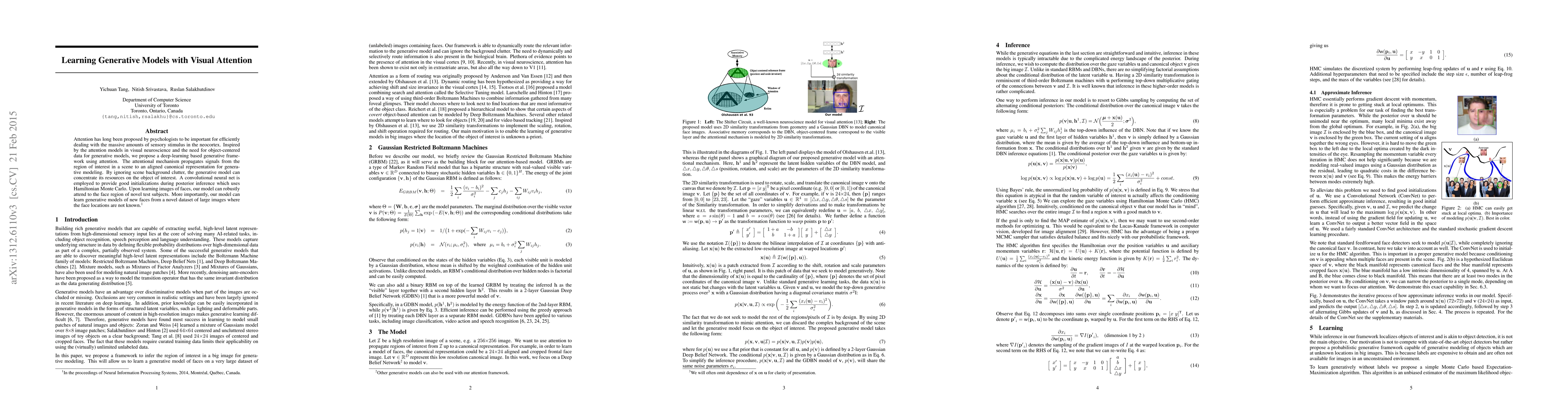 Attention has long been proposed by psychologists as important for effectively dealing with the enormous sensory stimulus available in the neocortex. Inspired by the visual attention models in computational neuroscience and the need of object-centric data for generative models, we describe for generative learning framework using attentional mechanisms. Attentional mechanisms can propagate signals from region of interest in a scene to an aligned canonical representation, where generative modeling takes place. By ignoring background clutter, generative models can concentrate their resources on the object of interest. Our model is a proper graphical model where the 2D Similarity transformation is a part of the top-down process. A ConvNet is employed to provide good initializations during posterior inference which is based on Hamiltonian Monte Carlo. Upon learning images of faces, our model can robustly attend to face regions of novel test subjects. More importantly, our model can learn generative models of new faces from a novel dataset of large images where the face locations are not known.