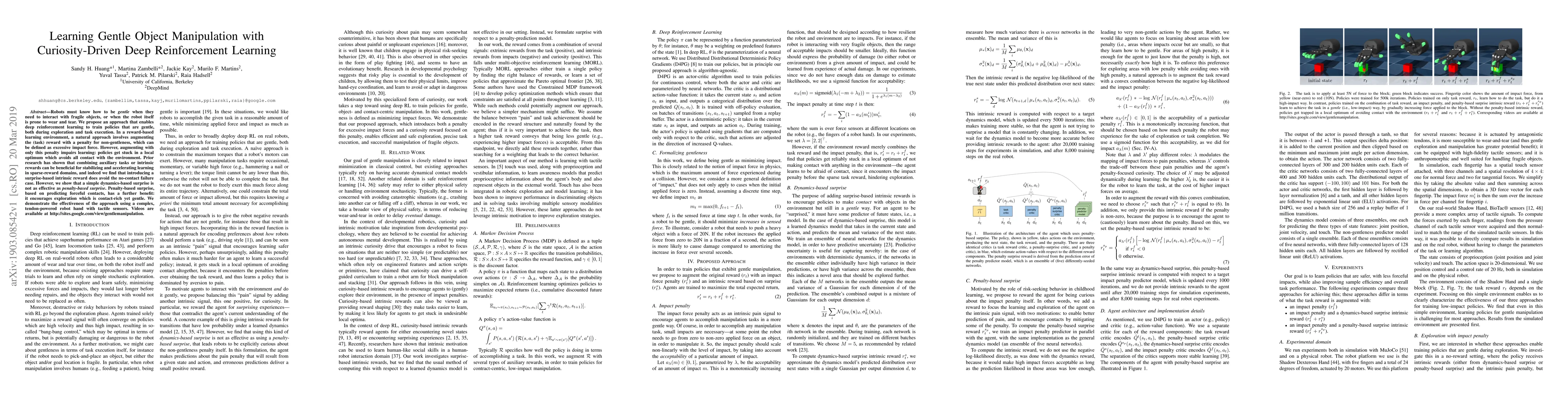 Robots must know how to be gentle when they need to interact with fragile objects, or when the robot itself is prone to wear and tear. We propose an approach that enables deep reinforcement learning to train policies that are gentle, both during exploration and task execution. In a reward-based learning environment, a natural approach involves augmenting the (task) reward with a penalty for non-gentleness, which can be defined as excessive impact force. However, augmenting with only this penalty impairs learning: policies get stuck in a local optimum which avoids all contact with the environment. Prior research has shown that combining auxiliary tasks or intrinsic rewards can be beneficial for stabilizing and accelerating learning in sparse-reward domains, and indeed we find that introducing a surprise-based intrinsic reward does avoid the no-contact failure case. However, we show that a simple dynamics-based surprise is not as effective as penalty-based surprise. Penalty-based surprise, based on predicting forceful contacts, has a further benefit: it encourages exploration which is contact-rich yet gentle. We demonstrate the effectiveness of the approach using a complex, tendon-powered robot hand with tactile sensors. Videos are available at http://sites.google.com/view/gentlemanipulation.