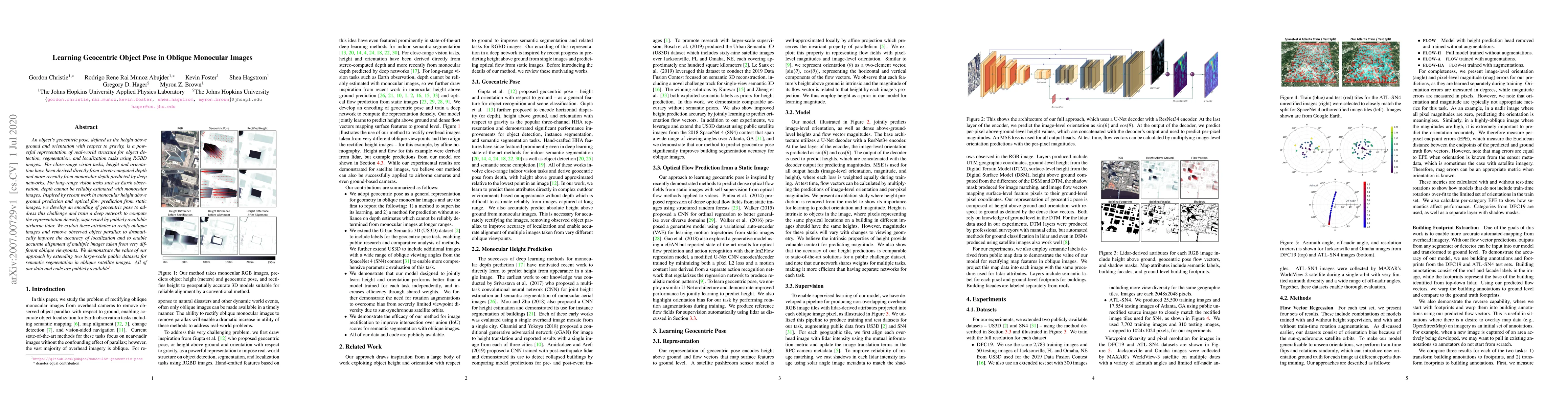 An object's geocentric pose, defined as the height above ground and orientation with respect to gravity, is a powerful representation of real-world structure for object detection, segmentation, and localization tasks using RGBD images. For close-range vision tasks, height and orientation have been derived directly from stereo-computed depth and more recently from monocular depth predicted by deep networks. For long-range vision tasks such as Earth observation, depth cannot be reliably estimated with monocular images. Inspired by recent work in monocular height above ground prediction and optical flow prediction from static images, we develop an encoding of geocentric pose to address this challenge and train a deep network to compute the representation densely, supervised by publicly available airborne lidar. We exploit these attributes to rectify oblique images and remove observed object parallax to dramatically improve the accuracy of localization and to enable accurate alignment of multiple images taken from very different oblique viewpoints. We demonstrate the value of our approach by extending two large-scale public datasets for semantic segmentation in oblique satellite images. All of our data and code are publicly available.