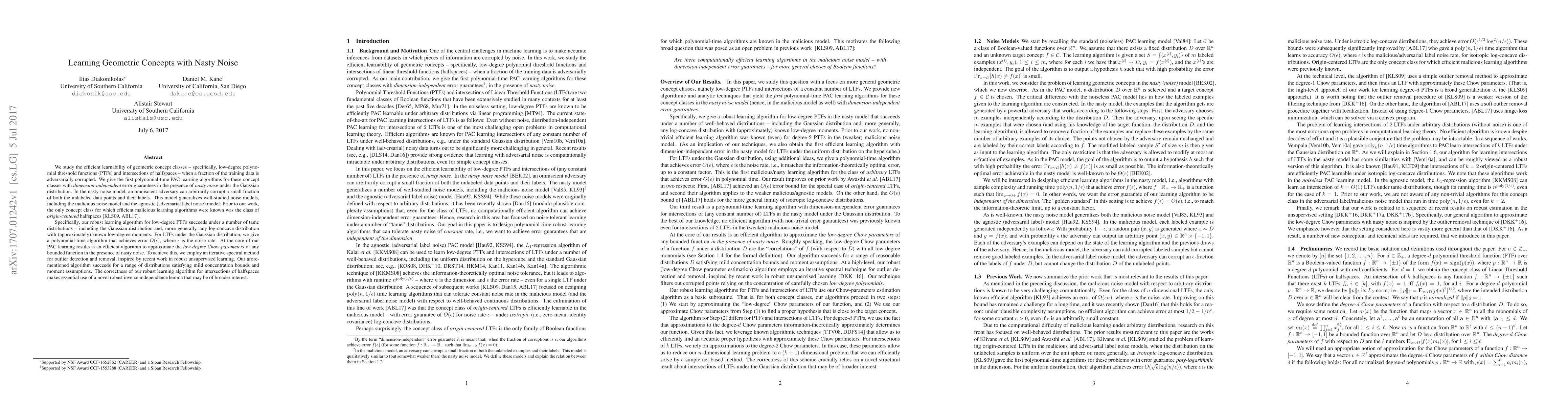 Researchers developed efficient learning algorithms for geometric concept classes with noisy data, achieving polynomial-time PAC learning with dimension-independent error guarantees under the nasty noise model.
