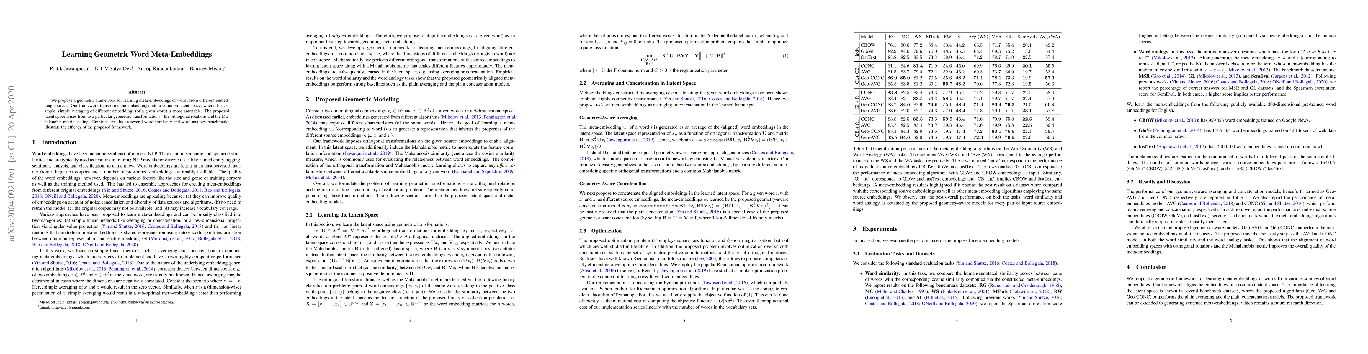 This paper introduces a geometric framework to learn meta-embeddings of words by transforming various embeddings into a common latent space using orthogonal rotations and Mahalanobis scaling, demonstrating improved performance on word similarity and analogy tasks.