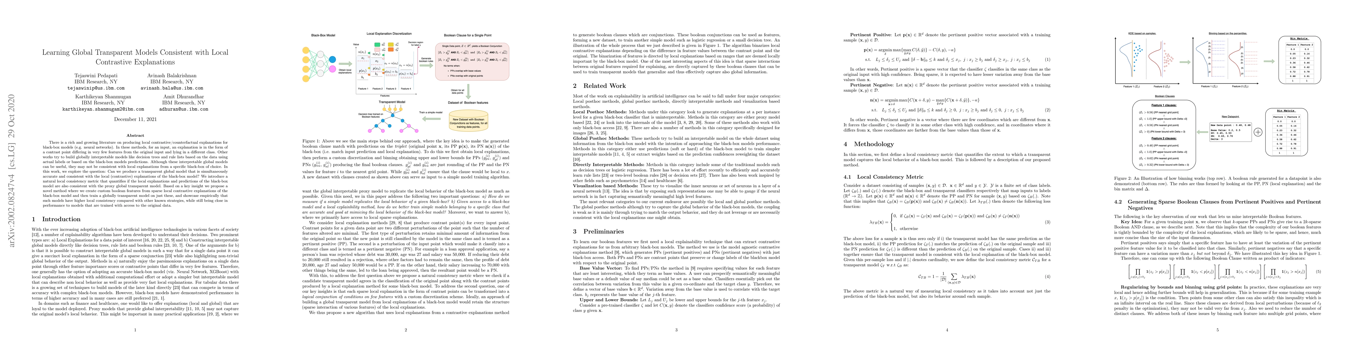 This paper proposes a method to construct a globally transparent model that maintains accuracy and consistency with local contrastive explanations from a black-box model. It introduces a new local consistency metric and a novel technique to create custom boolean features from sparse local explanations, which are then used to train the transparent model, achieving higher local consistency compared to other strategies.