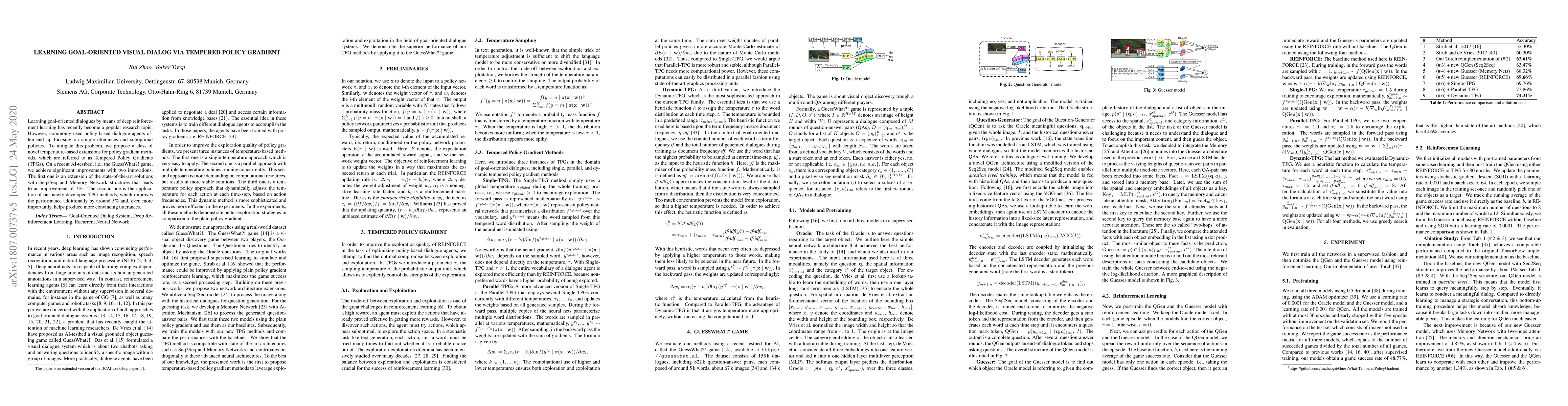 Learning goal-oriented dialogues by means of deep reinforcement learning has recently become a popular research topic. However, commonly used policy-based dialogue agents often end up focusing on simple utterances and suboptimal policies. To mitigate this problem, we propose a class of novel temperature-based extensions for policy gradient methods, which are referred to as Tempered Policy Gradients (TPGs). On a recent AI-testbed, i.e., the GuessWhat?! game, we achieve significant improvements with two innovations. The first one is an extension of the state-of-the-art solutions with Seq2Seq and Memory Network structures that leads to an improvement of 7%. The second one is the application of our newly developed TPG methods, which improves the performance additionally by around 5% and, even more importantly, helps produce more convincing utterances.