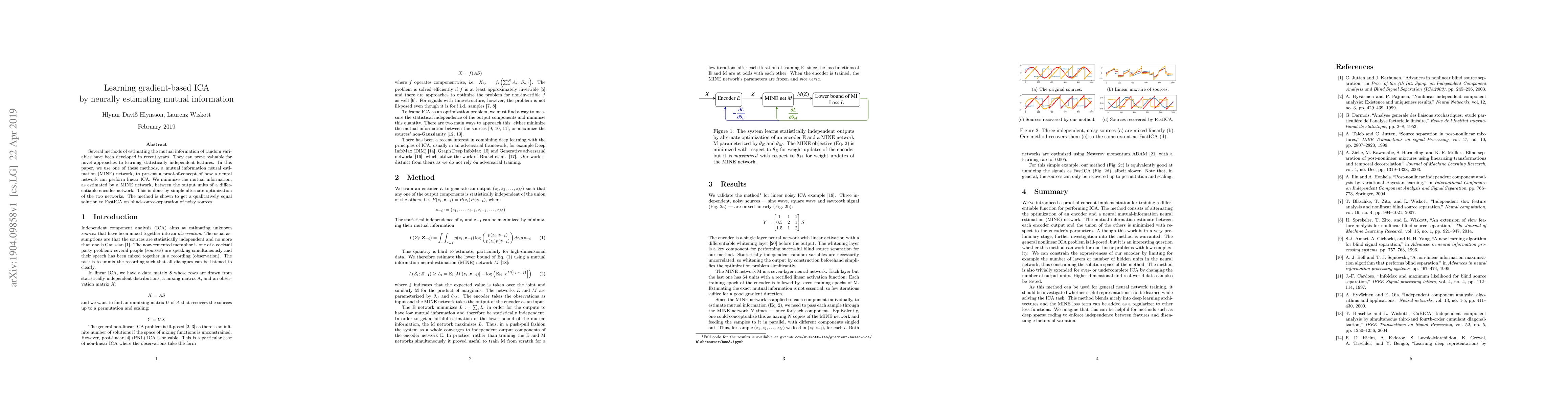 This paper proposes a neural network approach to perform linear independent component analysis (ICA) by minimizing mutual information, estimated via a mutual information neural estimation (MINE) network, between the outputs of a differentiable encoder. The method achieves comparable results to FastICA in blind-source-separation tasks.