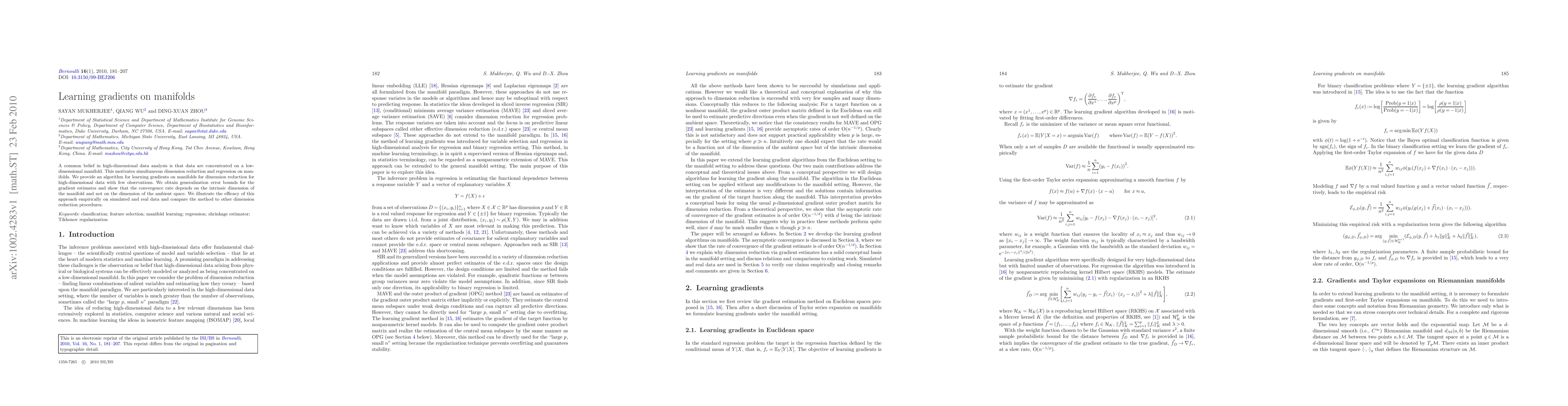 Proposes a novel algorithm for learning gradients on manifolds, providing theoretical generalization error bounds and empirical validation.