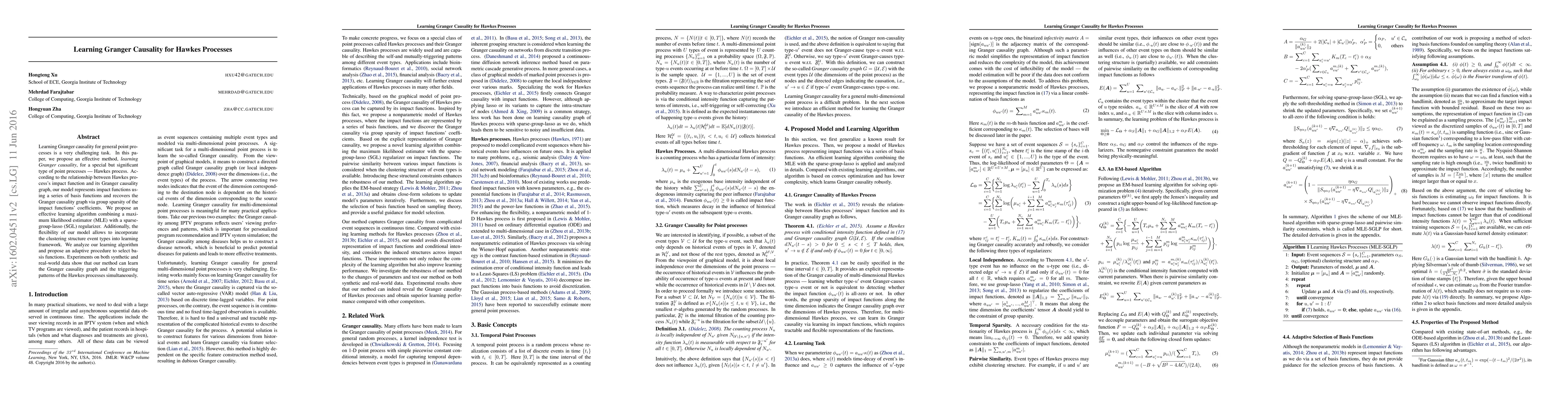 This paper proposes a method for learning Granger causality in Hawkes processes, leveraging a model that uses basis functions to represent impact functions and a sparse-group-lasso regularizer to recover Granger causality graphs. The method also incorporates event type clustering and demonstrates effectiveness through synthetic and real-world data experiments.
