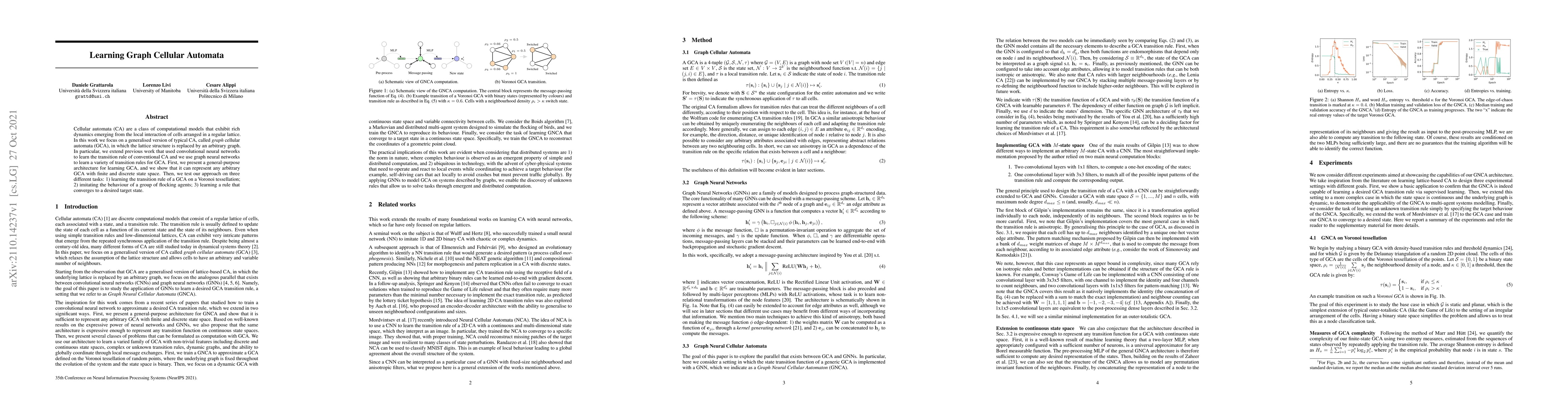 This paper proposes a method to learn the transition rules of graph cellular automata (GCA) using graph neural networks. It presents an architecture capable of representing any GCA with finite and discrete state space and demonstrates its effectiveness on tasks including learning GCA on a Voronoi tessellation, imitating flocking agents, and achieving a desired target state.