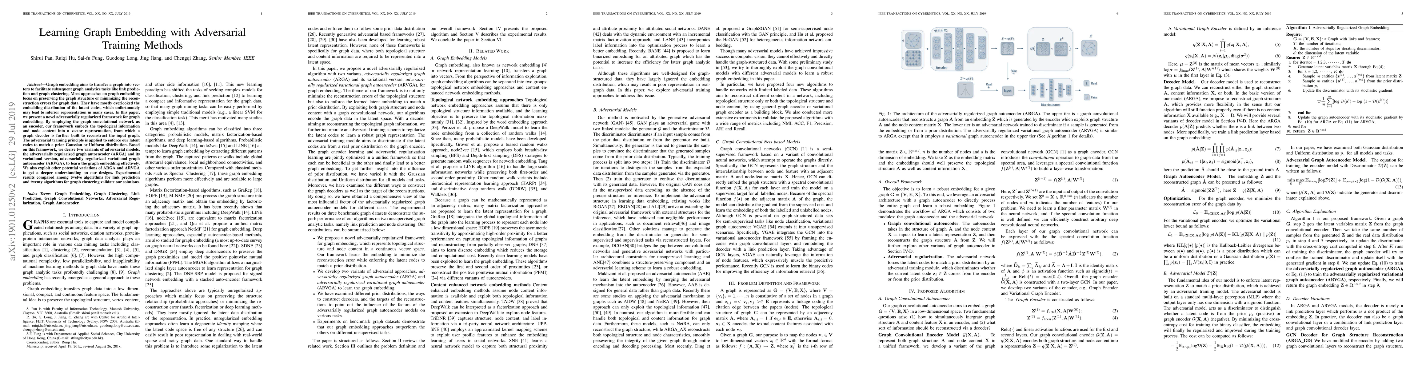 Graph embedding aims to transfer a graph into vectors to facilitate subsequent graph analytics tasks like link prediction and graph clustering. Most approaches on graph embedding focus on preserving the graph structure or minimizing the reconstruction errors for graph data. They have mostly overlooked the embedding distribution of the latent codes, which unfortunately may lead to inferior representation in many cases. In this paper, we present a novel adversarially regularized framework for graph embedding. By employing the graph convolutional network as an encoder, our framework embeds the topological information and node content into a vector representation, from which a graph decoder is further built to reconstruct the input graph. The adversarial training principle is applied to enforce our latent codes to match a prior Gaussian or Uniform distribution. Based on this framework, we derive two variants of adversarial models, the adversarially regularized graph autoencoder (ARGA) and its variational version, adversarially regularized variational graph autoencoder (ARVGA), to learn the graph embedding effectively. We also exploit other potential variations of ARGA and ARVGA to get a deeper understanding on our designs. Experimental results compared among twelve algorithms for link prediction and twenty algorithms for graph clustering validate our solutions.