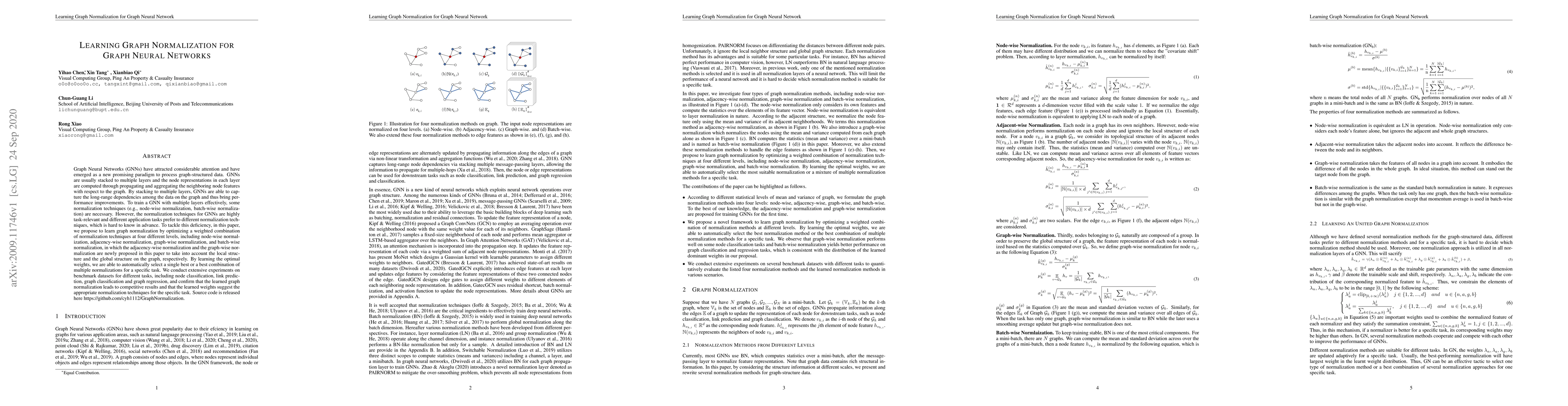 Graph Neural Networks (GNNs) have attracted considerable attention and have emerged as a new promising paradigm to process graph-structured data. GNNs are usually stacked to multiple layers and the node representations in each layer are computed through propagating and aggregating the neighboring node features with respect to the graph. By stacking to multiple layers, GNNs are able to capture the long-range dependencies among the data on the graph and thus bring performance improvements. To train a GNN with multiple layers effectively, some normalization techniques (e.g., node-wise normalization, batch-wise normalization) are necessary. However, the normalization techniques for GNNs are highly task-relevant and different application tasks prefer to different normalization techniques, which is hard to know in advance. To tackle this deficiency, in this paper, we propose to learn graph normalization by optimizing a weighted combination of normalization techniques at four different levels, including node-wise normalization, adjacency-wise normalization, graph-wise normalization, and batch-wise normalization, in which the adjacency-wise normalization and the graph-wise normalization are newly proposed in this paper to take into account the local structure and the global structure on the graph, respectively. By learning the optimal weights, we are able to automatically select a single best or a best combination of multiple normalizations for a specific task. We conduct extensive experiments on benchmark datasets for different tasks, including node classification, link prediction, graph classification and graph regression, and confirm that the learned graph normalization leads to competitive results and that the learned weights suggest the appropriate normalization techniques for the specific task. Source code is released here https://github.com/cyh1112/GraphNormalization.