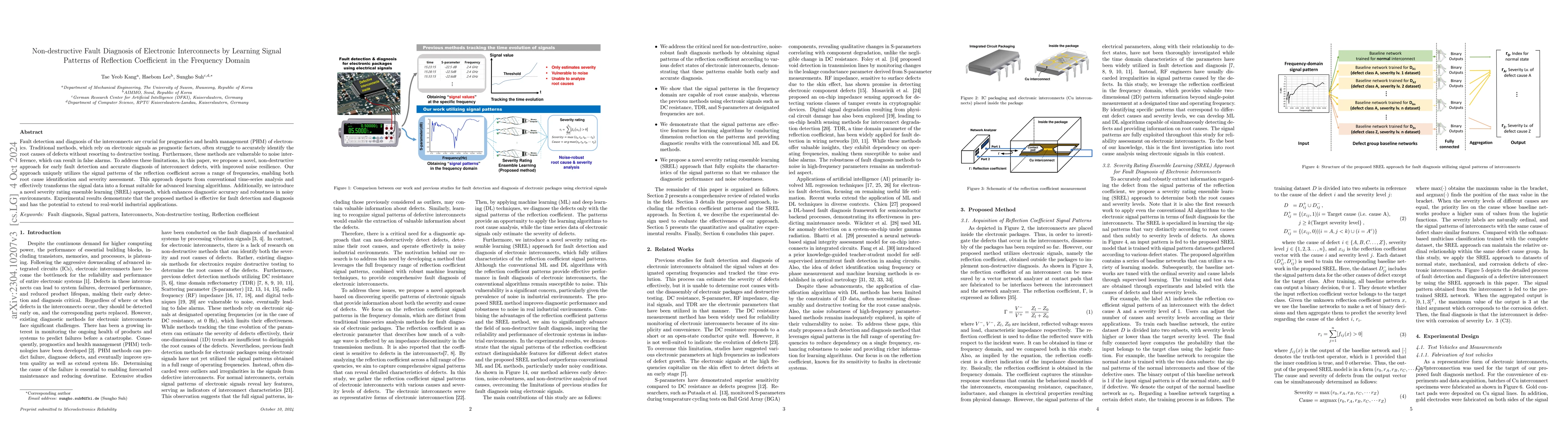 With the increasing operating frequencies and clock speeds in processors, interconnects affect both the reliability and performance of entire electronic systems. Fault detection and diagnosis of the interconnects are crucial for prognostics and health management (PHM) of electronics. However, traditional approaches using electrical signals as prognostic factors often face challenges in distinguishing defect root causes, necessitating additional destructive evaluations, and are prone to noise interference, leading to potential false alarms. To address these limitations, this paper introduces a novel approach for non-destructive detection and diagnosis of defects in Cu interconnects, offering early detection, enhanced diagnostic accuracy, and noise resilience. Our approach uniquely analyzes both the root cause and severity of interconnect defects by leveraging graph patterns of reflection coefficient, a technique distinct from traditional time series signal analysis. We experimentally demonstrate that the graph patterns possess the capability for fault diagnosis and serve as effective input data for learning algorithms. Additionally, we introduce a novel severity rating ensemble learning (SREL) approach, which significantly enhances diagnostic accuracy and noise robustness. Experimental results demonstrate that the proposed method outperforms conventional machine learning methods and multi-class convolutional neural networks (CNN), achieving a maximum accuracy of 99.3%, especially under elevated noise levels.